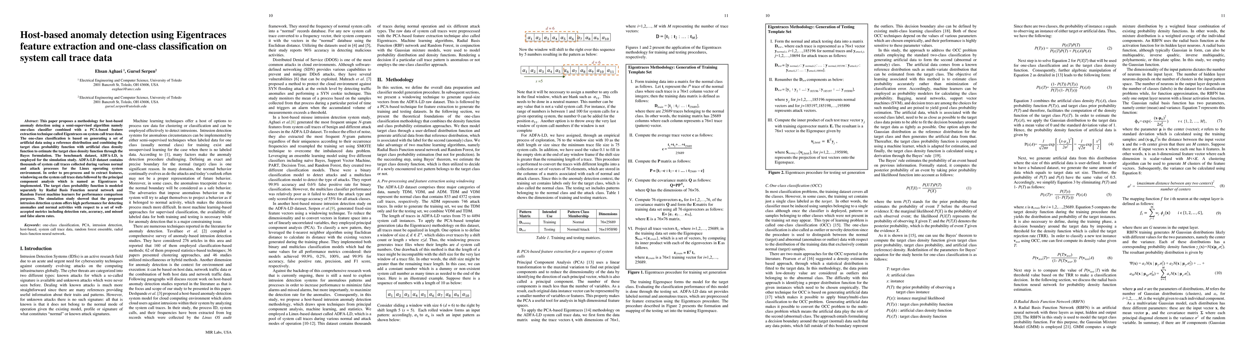 A new method for host-based anomaly detection is proposed using Eigentraces feature extraction and one-class classification on system call trace data, achieving high performance in detecting anomalies and normal activities.