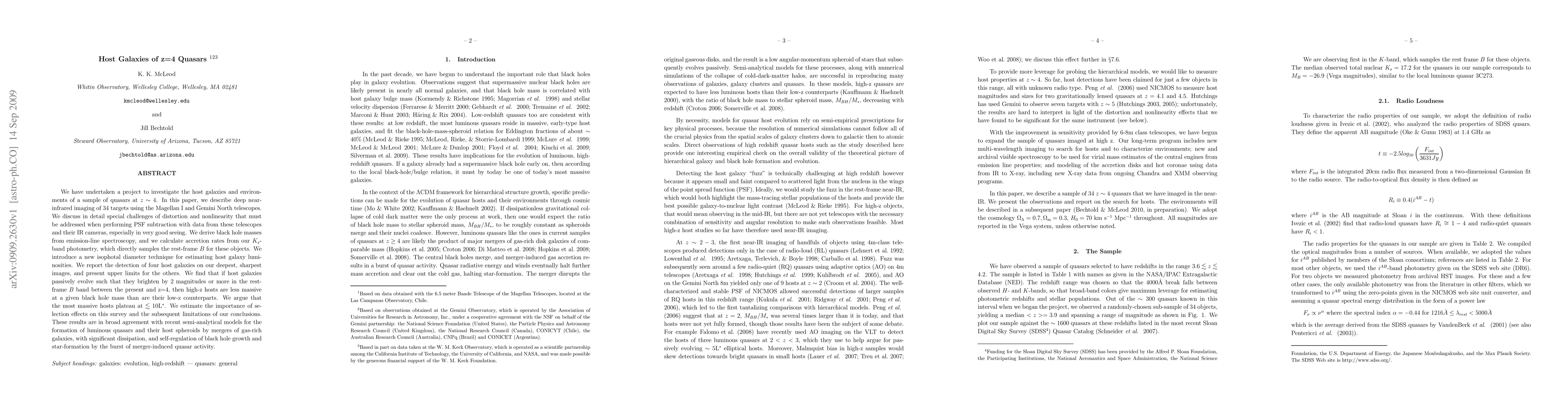 We have undertaken a project to investigate the host galaxies and environments of a sample of quasars at z~4. In this paper, we describe deep near-infrared imaging of 34 targets using the Magellan I and Gemini North telescopes. We discuss in detail special challenges of distortion and nonlinearity that must be addressed when performing PSF subtraction with data from these telescopes and their IR cameras, especially in very good seeing. We derive black hole masses from emission-line spectroscopy, and we calculate accretion rates from our K_s-band photometry, which directly samples the rest-frame B for these objects. We introduce a new isophotal diameter technique for estimating host galaxy luminosities. We report the detection of four host galaxies on our deepest, sharpest images, and present upper limits for the others. We find that if host galaxies passively evolve such that they brighten by 2 magnitudes or more in the rest-frame B band between the present and z=4, then high-z hosts are less massive at a given black hole mass than are their low-z counterparts. We argue that the most massive hosts plateau at <~10L*. We estimate the importance of selection effects on this survey and the subsequent limitations of our conclusions. These results are in broad agreement with recent semi-analytical models for the formation of luminous quasars and their host spheroids by mergers of gas-rich galaxies, with significant dissipation, and self-regulation of black hole growth and star-formation by the burst of merger-induced quasar activity.