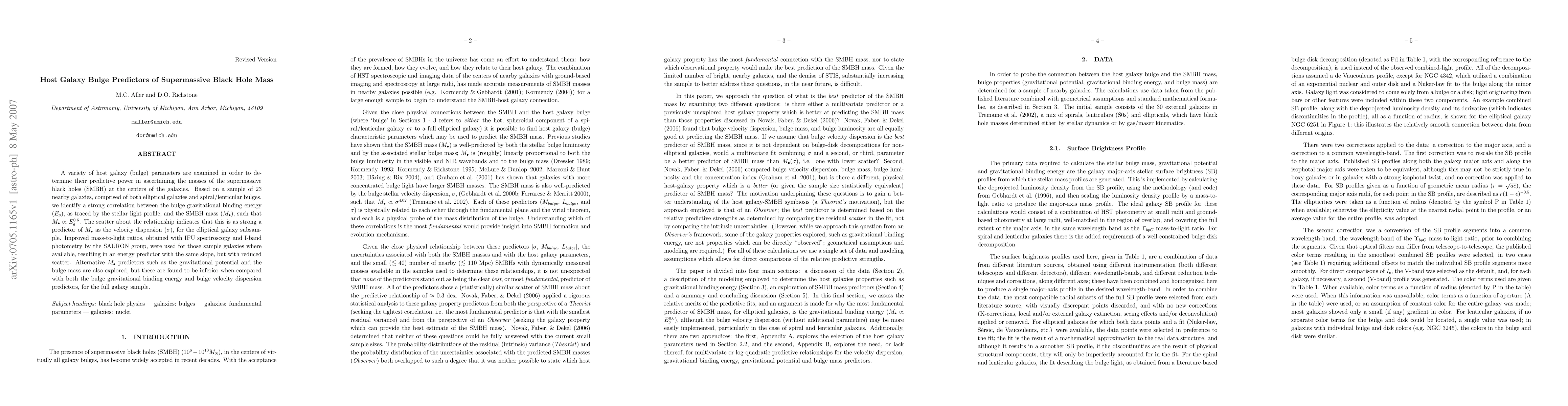 This paper investigates host galaxy bulge parameters to predict supermassive black hole masses, finding a strong correlation between bulge gravitational binding energy and black hole mass. The study concludes that this energy predictor is as effective as velocity dispersion for elliptical galaxies, with improved accuracy using advanced mass-to-light ratios.