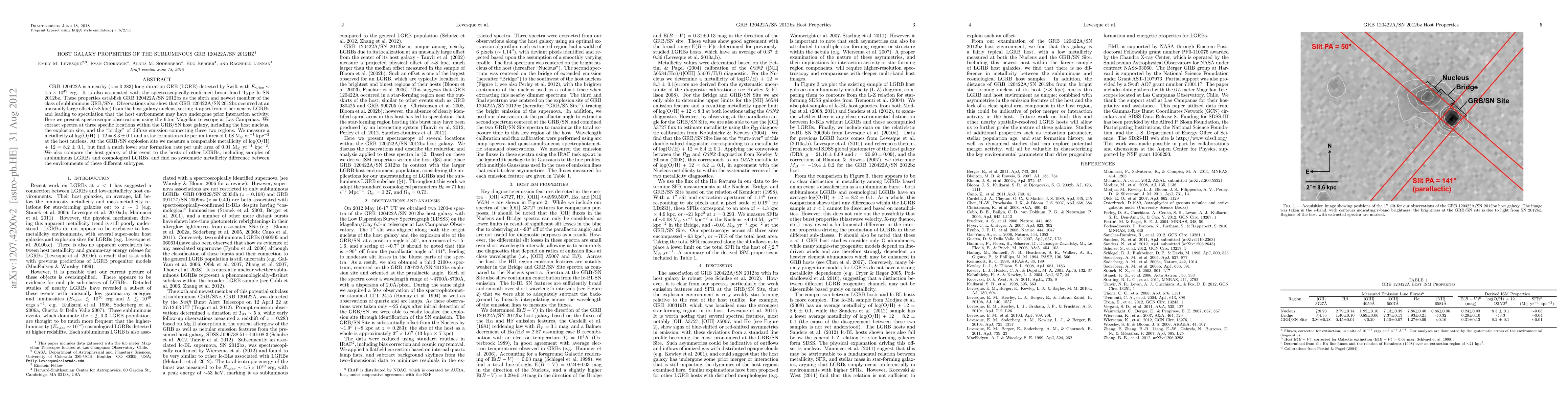This paper investigates the host galaxy properties of the subluminous GRB 120422A/SN 2012bz, revealing a low star formation rate at the explosion site compared to the host nucleus, while finding no significant metallicity differences among various GRB host galaxies.