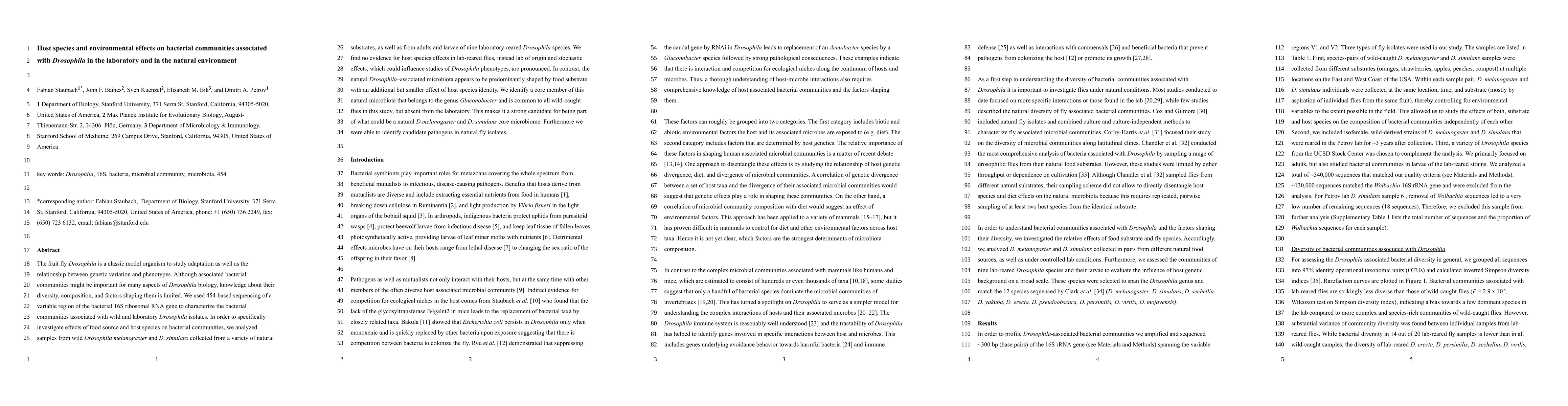 This study characterizes bacterial communities associated with wild and laboratory Drosophila species using 16S rRNA gene sequencing. It finds that laboratory flies' microbiota are shaped more by lab origin and stochastic effects, while wild flies' microbiota are primarily influenced by food substrate and host species, with a notable core member, Gluconobacter, common in wild flies but absent in lab flies.