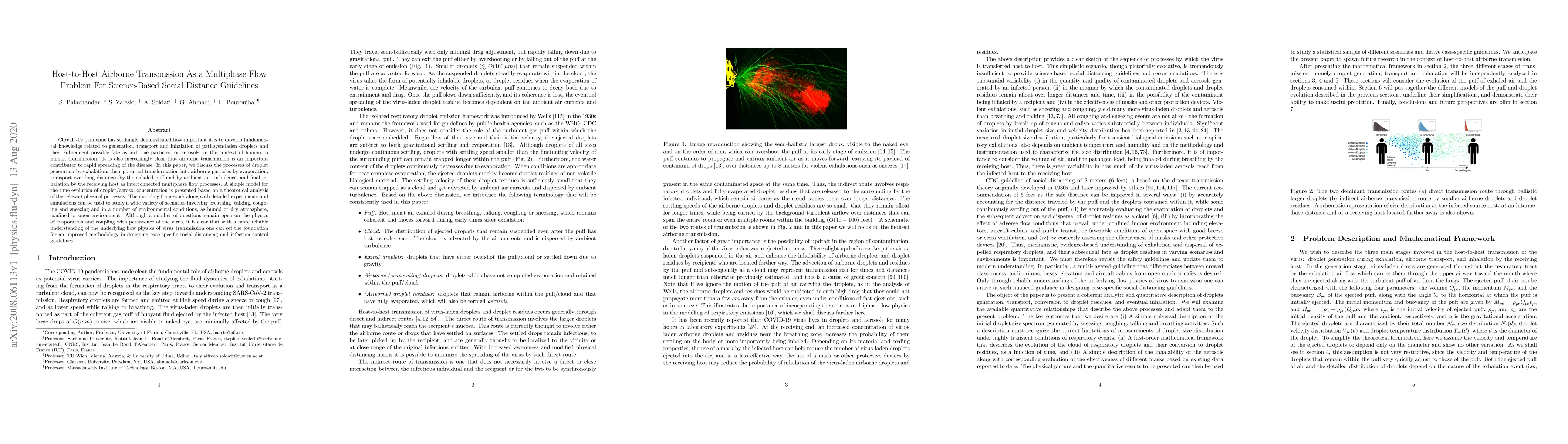 COVID-19 pandemic has strikingly demonstrated how important it is to develop fundamental knowledge related to generation, transport and inhalation of pathogen-laden droplets and their subsequent possible fate as airborne particles, or aerosols, in the context of human to human transmission. It is also increasingly clear that airborne transmission is an important contributor to rapid spreading of the disease. In this paper, we discuss the processes of droplet generation by exhalation, their potential transformation into airborne particles by evaporation, transport over long distances by the exhaled puff and by ambient air turbulence, and final inhalation by the receiving host as interconnected multiphase flow processes. A simple model for the time evolution of droplet/aerosol concentration is presented based on a theoretical analysis of the relevant physical processes. The modeling framework along with detailed experiments and simulations can be used to study a wide variety of scenarios involving breathing, talking, coughing and sneezing and in a number of environmental conditions, as humid or dry atmosphere, confined or open environment. Although a number of questions remain open on the physics of evaporation and coupling with persistence of the virus, it is clear that with a more reliable understanding of the underlying flow physics of virus transmission one can set the foundation for an improved methodology in designing case-specific social distancing and infection control guidelines.