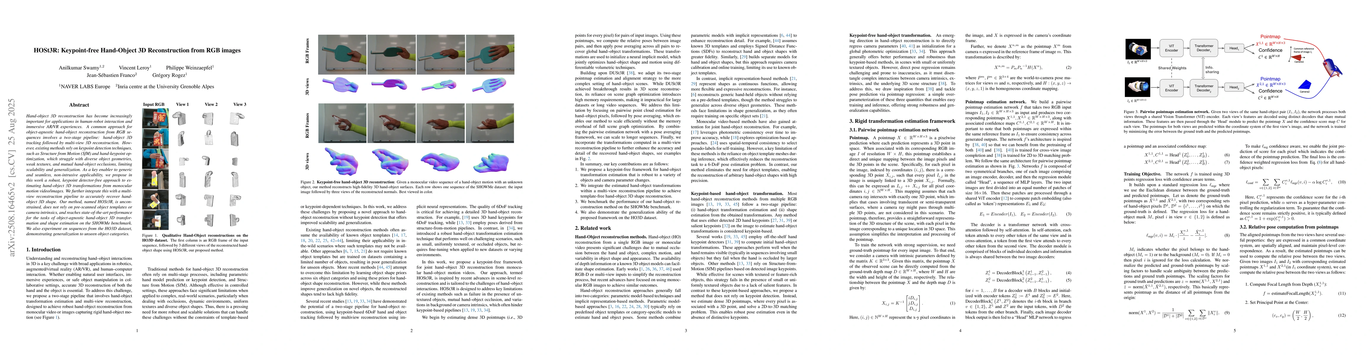 Hand-object 3D reconstruction has become increasingly important for applications in human-robot interaction and immersive AR/VR experiences. A common approach for object-agnostic hand-object reconstruction from RGB sequences involves a two-stage pipeline: hand-object 3D tracking followed by multi-view 3D reconstruction. However, existing methods rely on keypoint detection techniques, such as Structure from Motion (SfM) and hand-keypoint optimization, which struggle with diverse object geometries, weak textures, and mutual hand-object occlusions, limiting scalability and generalization. As a key enabler to generic and seamless, non-intrusive applicability, we propose in this work a robust, keypoint detector-free approach to estimating hand-object 3D transformations from monocular motion video/images. We further integrate this with a multi-view reconstruction pipeline to accurately recover hand-object 3D shape. Our method, named HOSt3R, is unconstrained, does not rely on pre-scanned object templates or camera intrinsics, and reaches state-of-the-art performance for the tasks of object-agnostic hand-object 3D transformation and shape estimation on the SHOWMe benchmark. We also experiment on sequences from the HO3D dataset, demonstrating generalization to unseen object categories.