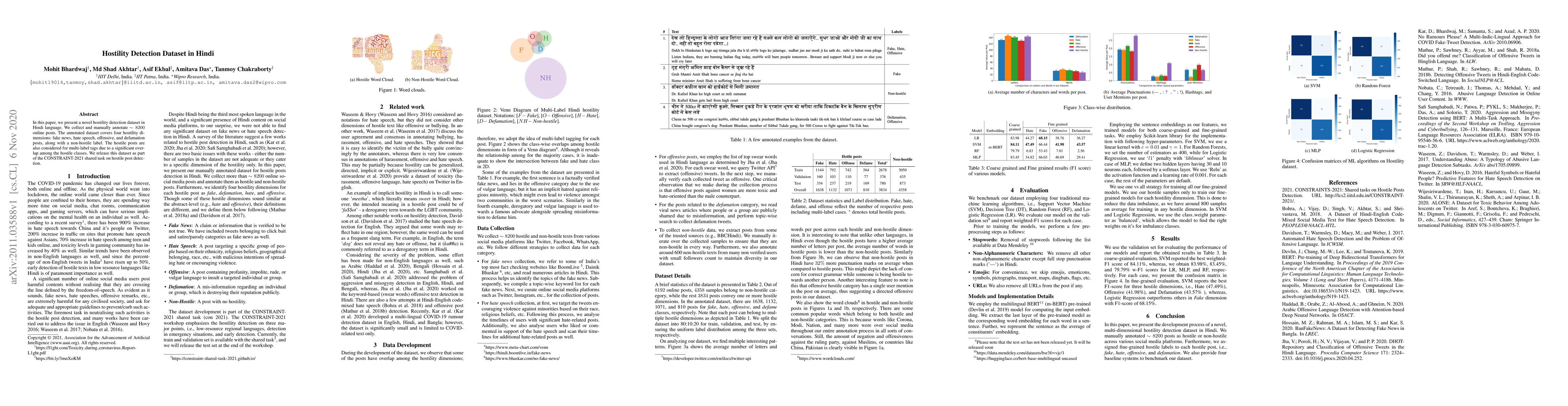 This paper introduces a new dataset in Hindi for detecting hostility, including ~8200 annotated online posts categorized into four dimensions: fake news, hate speech, offensive, and defamation, with a non-hostile label. The dataset supports multi-label tagging due to overlaps among hostile classes and is released for the CONSTRAINT-2021 shared task.