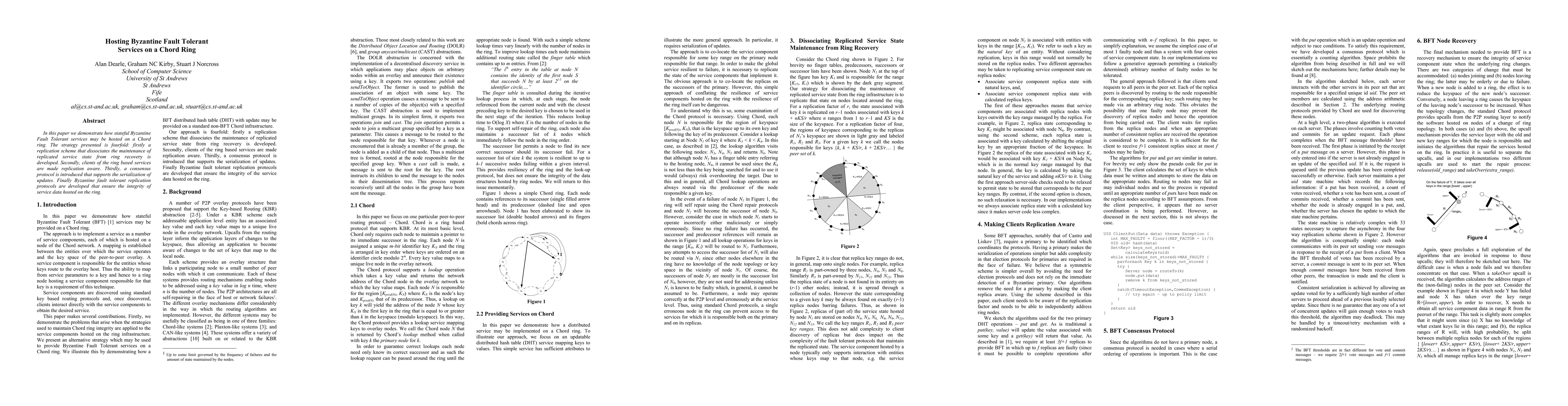 This paper presents a four-part strategy for hosting Byzantine Fault Tolerant services on a Chord ring, including a replication scheme, replication-aware clients, a consensus protocol for serialization, and Byzantine fault tolerant replication protocols to maintain service data integrity.