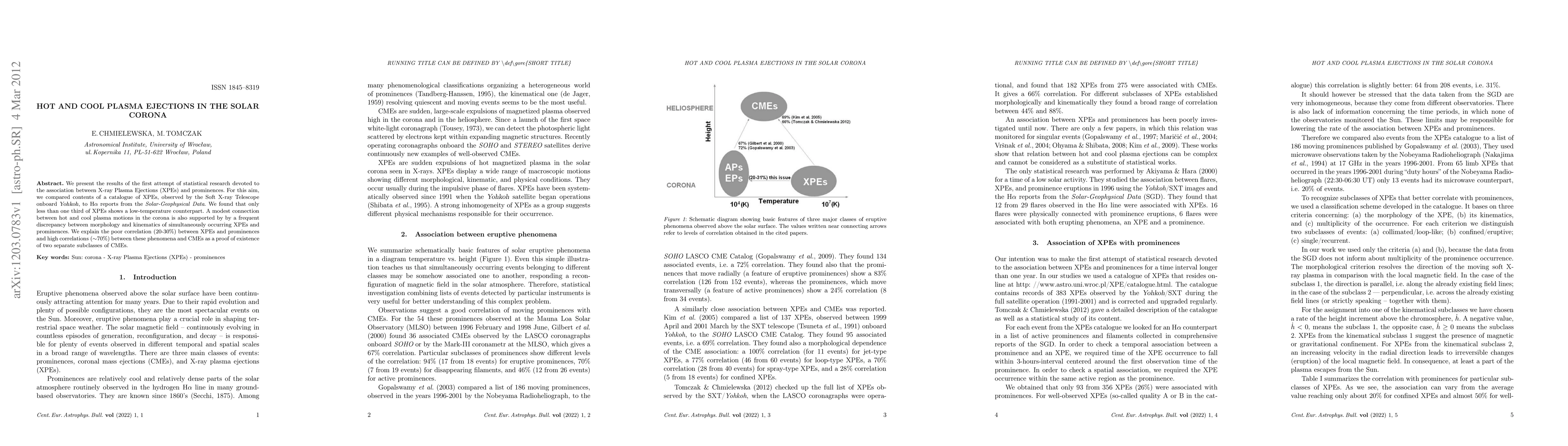 We present the results of the first attempt of statistical research devoted to the association between X-ray Plasma Ejections (XPEs) and prominences. For this aim, we compared contents of a catalogue of XPEs, observed by the Soft X-ray Telescope onboard Yohkoh, to H$\alpha$ reports from the Solar-Geophysical Data. We found that only less than one third of XPEs shows a low-temperature counterpart. A modest connection between hot and cool plasma motions in the corona is also supported by by a frequent discrepancy between morphology and kinematics of simultaneously occurring XPEs and prominences. We explain the poor correlation (20-30 %) between XPEs and prominences and high correlations (~70%) between these phenomena and CMEs as a proof of existence of two separate subclasses of CMEs.