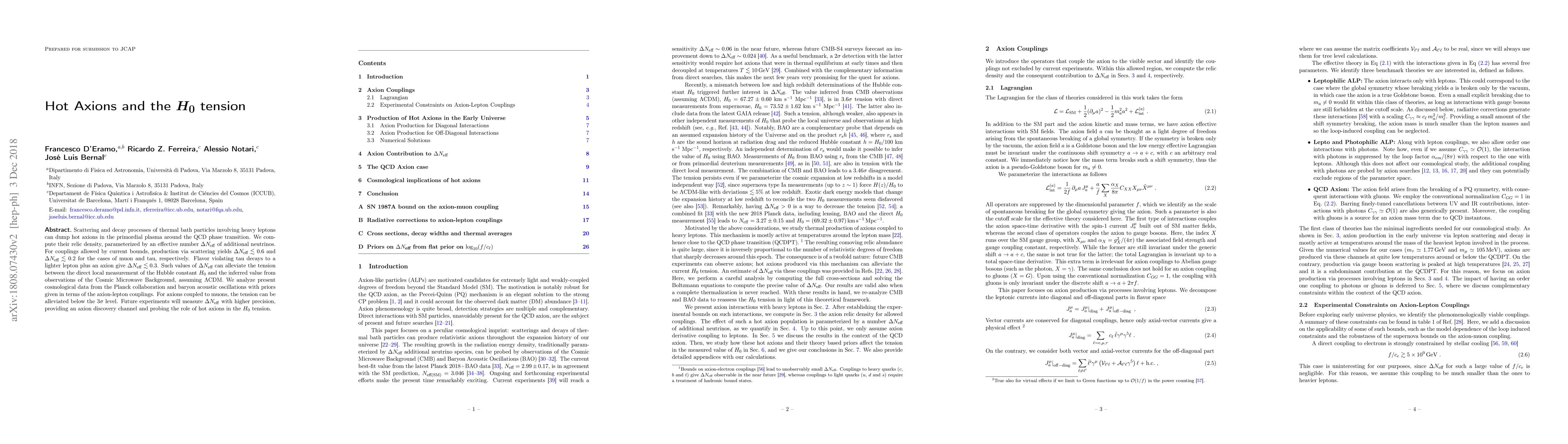 The research analyzes the impact of hot axions on cosmological parameters, specifically the Hubble constant tension ($H_0$), using scattering and decay processes of heavy leptons around the QCD phase transition. It computes the relic density parameterized by $\Delta N_{\rm eff}$ and evaluates its implications for alleviating the $H_0$ tension.