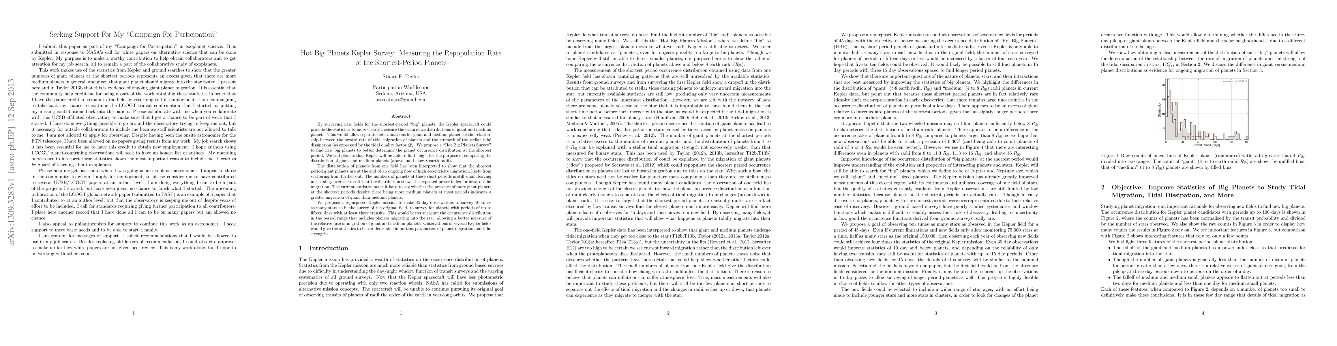 The Hot Big Planets Kepler Survey aims to determine the repopulation rate of the shortest-period giant planets by surveying new fields for transiting "big" planets. This survey seeks to clarify the relationship between tidal migration rates and stellar tidal dissipation, and to better understand the distribution of giant versus medium planets.