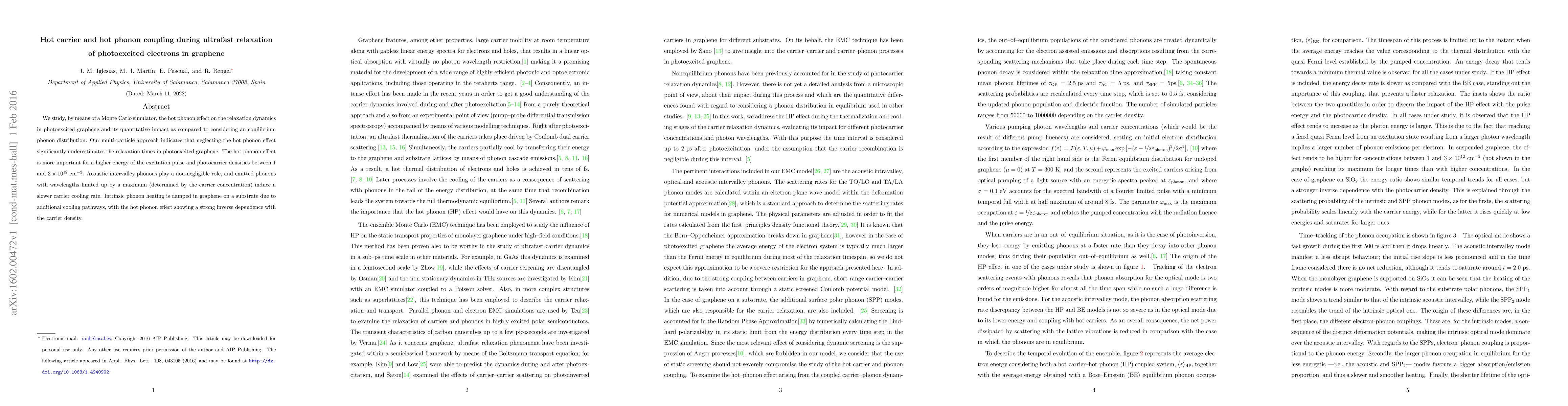 We study, by means of a Monte Carlo simulator, the hot phonon effect on the relaxation dynamics in photoexcited graphene and its quantitative impact as compared to considering an equilibrium phonon distribution. Our multi-particle approach indicates that neglecting the hot phonon effect significantly underestimates the relaxation times in photoexcited graphene. The hot phonon effect is more important for a higher energy of the excitation pulse and photocarrier densities between $1$ and $3\times 10^{12} \mathrm{~cm}^{-2}$. Acoustic intervalley phonons play a non-negligible role, and emitted phonons with wavelengths limited up by a maximum (determined by the carrier concentration) induce a slower carrier cooling rate. Intrinsic phonon heating is damped in graphene on a substrate due to additional cooling pathways, with the hot phonon effect showing a strong inverse dependence with the carrier density.