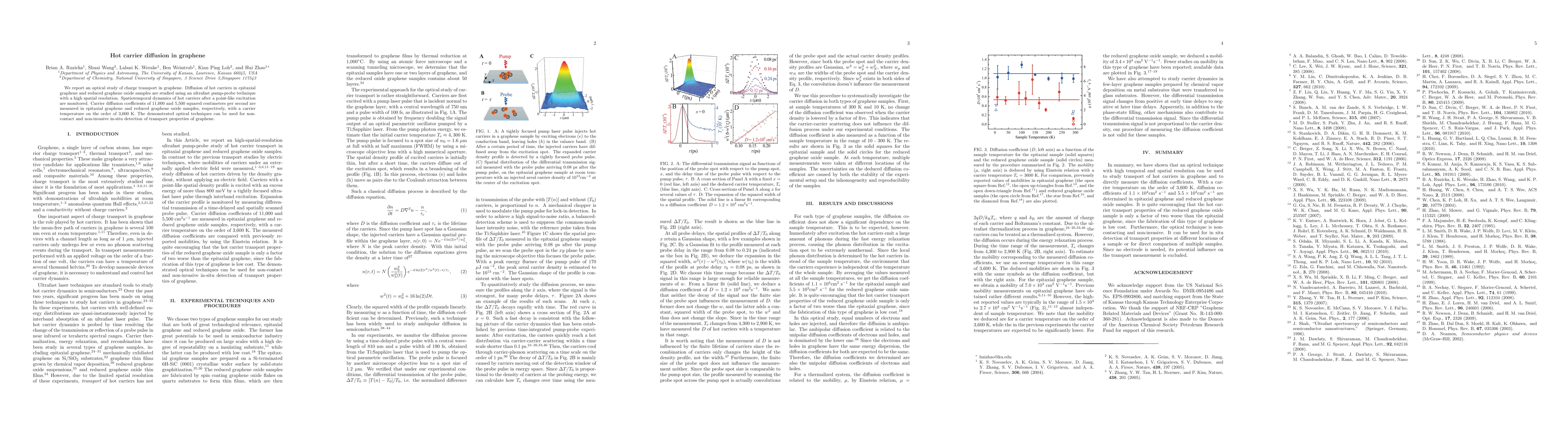 This study investigates charge transport in graphene using ultrafast optical techniques, finding hot carrier diffusion coefficients of 11,000 and 5,500 cm²/s in epitaxial graphene and reduced graphene oxide respectively, with carrier temperatures around 3,600 K. The techniques enable non-contact, non-invasive in-situ detection of graphene transport properties.