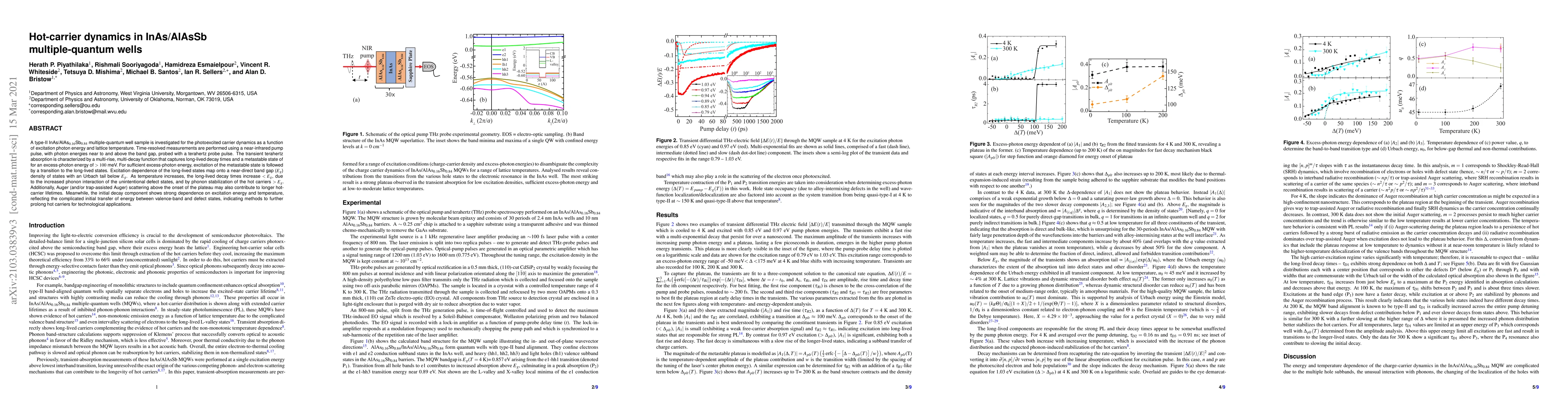 This study investigates the hot-carrier dynamics in InAs/AlAsSb multiple-quantum wells using time-resolved measurements. It reveals long-lived decay times and a metastable state for excess photon energies above 100 meV, with temperature-dependent phonon interactions influencing carrier lifetimes.