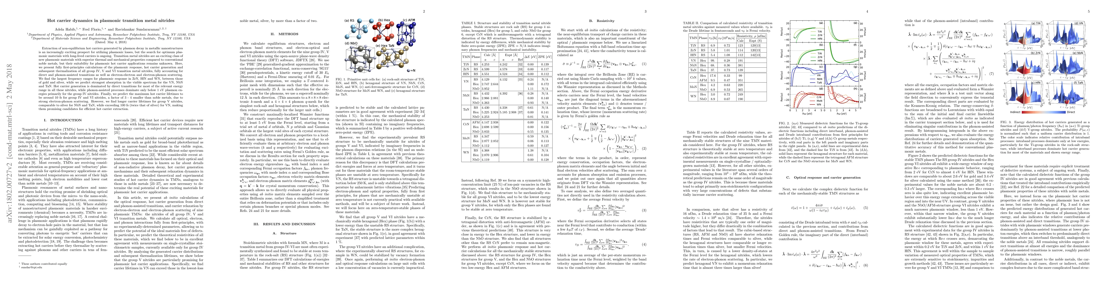 This paper uses first-principles calculations to investigate hot carrier dynamics in transition metal nitrides, finding ZrN, HfN, and WN exhibit broad plasmonic responses and strong visible spectrum absorption in VN, NbN, and TaN. While group IV and VI nitrides show shorter hot carrier lifetimes due to strong electron-phonon scattering, group V nitrides, particularly VN, have notably longer carrier lifetimes, suggesting they are promising for hot carrier applications.