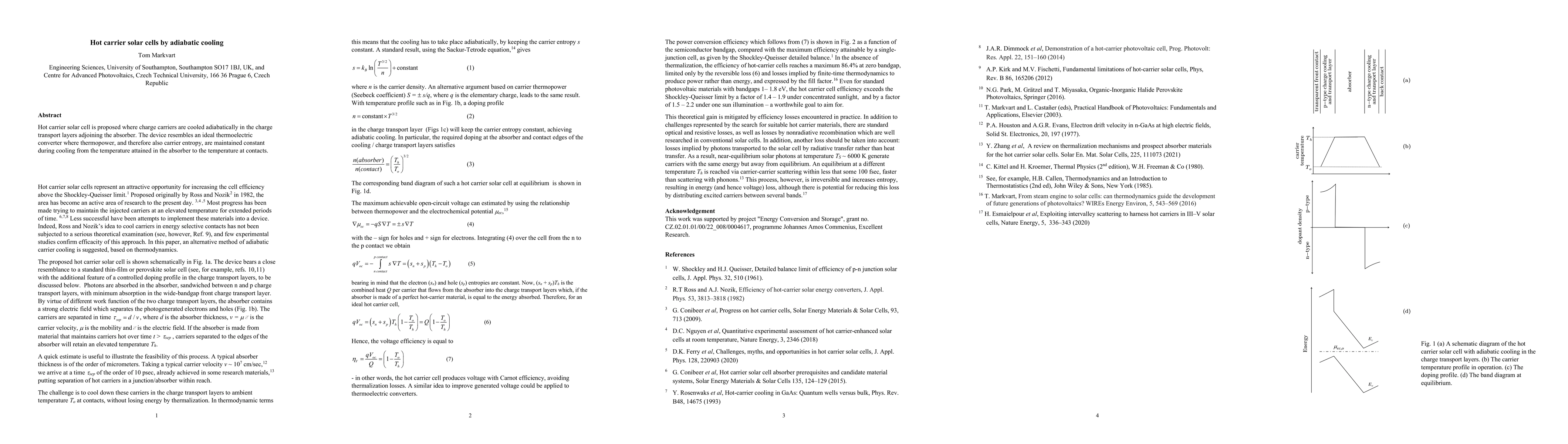 Hot carrier solar cells utilize adiabatic cooling to maintain constant thermopower and carrier entropy, potentially achieving higher efficiency by reducing energy losses from hot charge carriers. This approach resembles an ideal thermoelectric converter.
