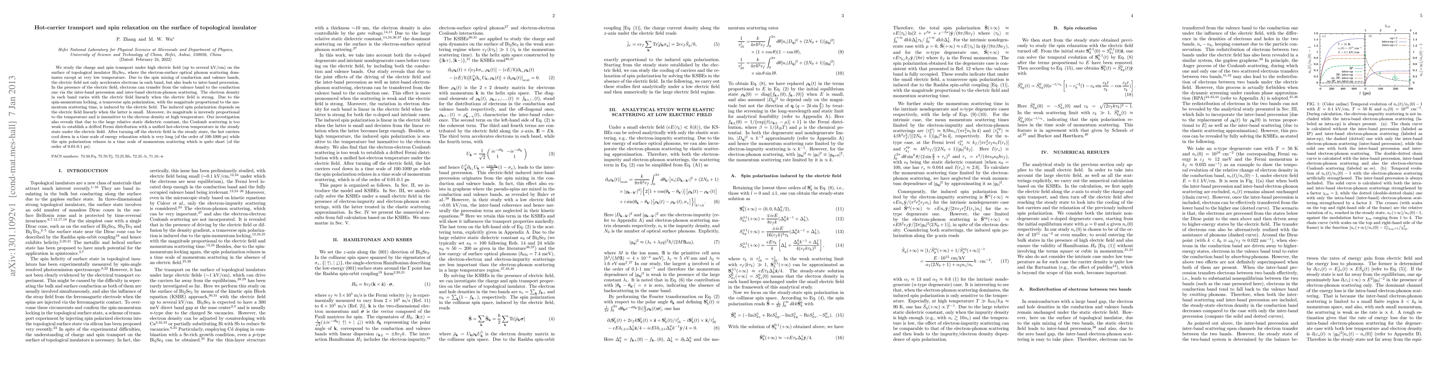 We study the charge and spin transport under high electric field (up to several kV/cm) on the surface of topological insulator Bi$_2$Se$_3$, where the electron-surface optical phonon scattering dominates except at very low temperature. Due to the spin mixing of conduction and valence bands, the electric field not only accelerates electrons in each band, but also leads to inter-band precession. In the presence of the electric field, electrons can transfer from the valence band to the conduction one via the inter-band precession and inter-band electron-phonon scattering. The electron density in each band varies with the electric field linearly when the electric field is strong. Due to the spin-momentum locking, a transverse spin polarization, with the magnitude proportional to the momentum scattering time, is induced by the electric field. The induced spin polarization depends on the electric field linearly when the latter is small. Moreover, its magnitude is inversely proportional to the temperature and is insensitive to the electron density at high temperature. Our investigation also reveals that due to the large relative static dielectric constant, the Coulomb scattering is too weak to establish a drifted Fermi distribution with a unified hot-electron temperature in the steady state under the electric field. After turning off the electric field in the steady state, the hot carriers cool down in a time scale of energy relaxation which is very long (of the order of 100-1000 ps) while the spin polarization relaxes in a time scale of momentum scattering which is quite short (of the order of 0.01-0.1 ps).