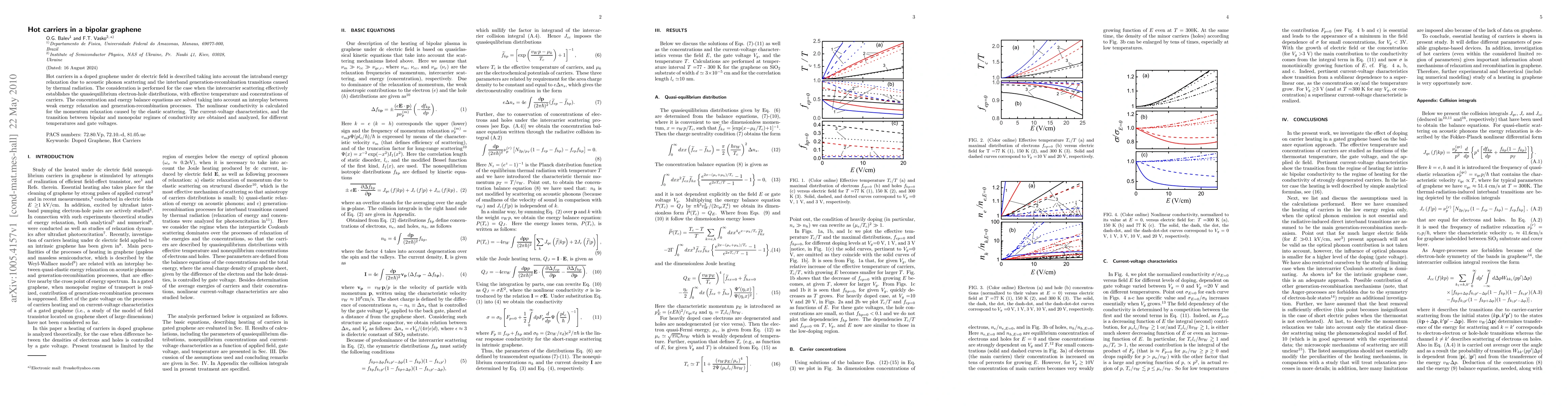 This research investigates hot carriers in doped graphene under a DC electric field, focusing on intraband relaxation via acoustic phonon scattering and interband transitions due to thermal radiation. It derives nonlinear conductivity and current-voltage characteristics, analyzing the transition between bipolar and monopolar conductivity regimes under varying temperatures and gate voltages.