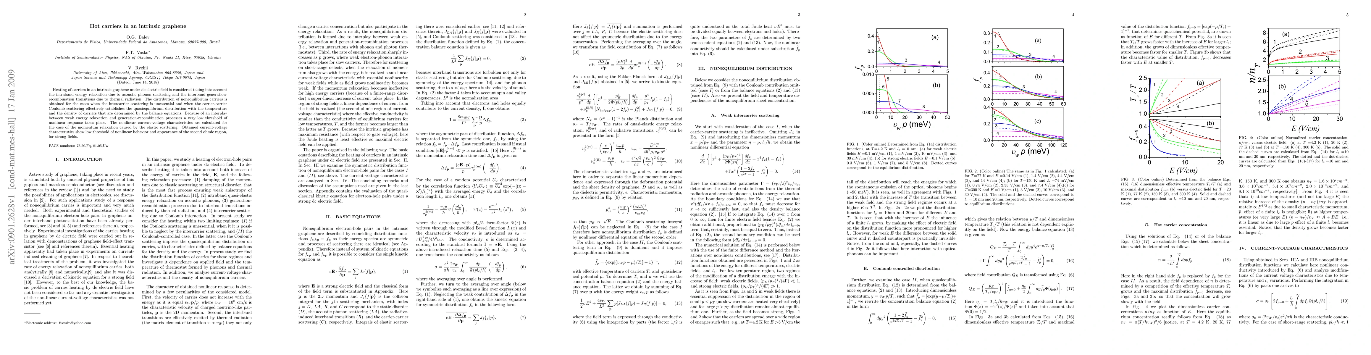 This paper investigates the heating of carriers in intrinsic graphene under a dc electric field, focusing on energy relaxation via acoustic phonon scattering and interband transitions due to thermal radiation. It reveals a low threshold for nonlinear response and calculates the current-voltage characteristics, showing a second ohmic region under strong fields.