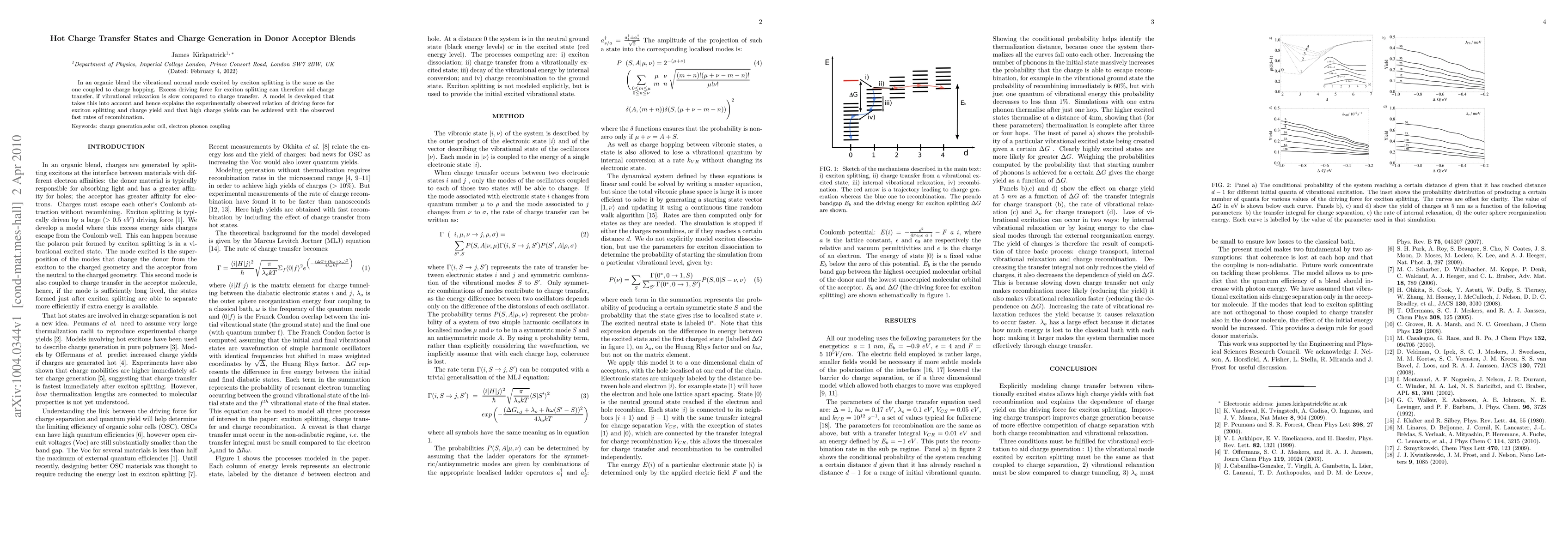 In an organic blend the vibrational normal mode excited by exciton splitting is the same as the one coupled to charge hopping. Excess driving force for exciton splitting can therefore aid charge transfer, if vibrational relaxation is slow compared to charge transfer. A model is developed that takes this into account and hence explains the experimentally observed relation of driving force for exciton splitting and charge yield and that high charge yields can be achieved with the observed fast rates of recombination.