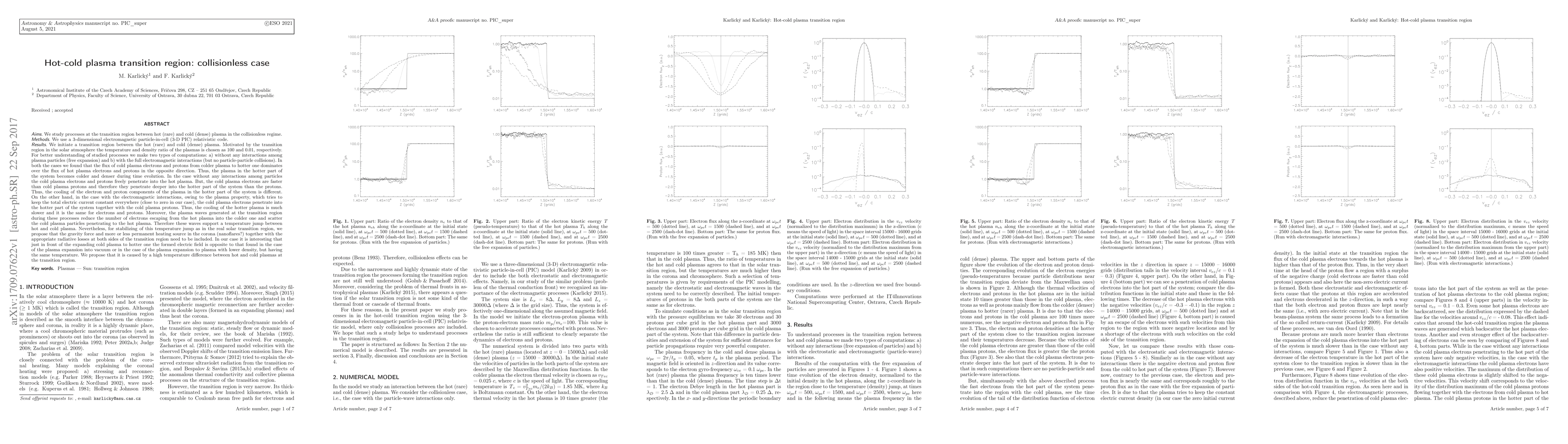 We study processes at the transition region between hot (rare) and cold (dense) plasma in the collisionless regime. We use a 3-dimensional electromagnetic particle-in-cell (3-D PIC) relativistic code. Motivated by the transition region in the solar atmosphere the temperature and density ratio of the plasmas is chosen as 100 and 0.01, respectively. For better understanding of studied processes we make two types of computations: a) without any interactions among plasma particles (free expansion) and b) with the full electromagnetic interactions. In both the cases we found that the flux of cold plasma electrons and protons from colder plasma to hotter one dominates over the flux of hot plasma electrons and protons in the opposite direction. Thus, the plasma in the hotter part of the system becomes colder and denser during time evolution. In the case without any interactions among particles the cold plasma electrons and protons freely penetrate into the hot plasma. But, the cold plasma electrons are faster than cold plasma protons and therefore they penetrate deeper into the hotter part of the system than the protons. Thus, the cooling of the electron and proton components of the plasma in the hotter part of the system is different. On the other hand, in the case with the electromagnetic interactions, owing to the plasma property, which tries to keep the total electric current constant everywhere (close to zero in our case), the cold plasma electrons penetrate into the hotter part of the system together with the cold plasma protons. The plasma waves generated at the transition region during these processes reduce the number of electrons escaping from the hot plasma into the colder one. Therefore these waves support a temperature jump between hot and cold plasma.