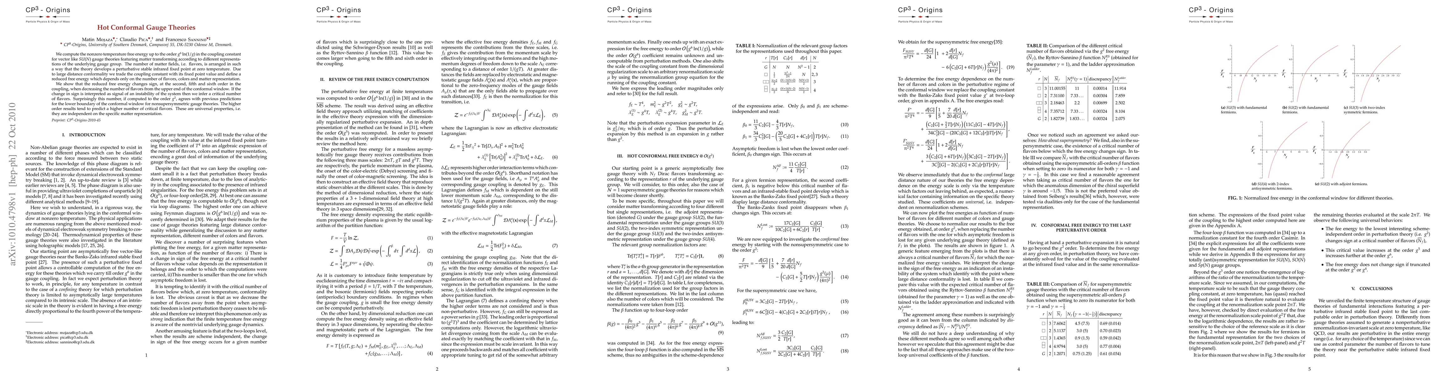 This paper computes the free energy of hot conformal gauge theories up to a specific order in the coupling constant, revealing a perturbative stable infrared fixed point. It identifies critical numbers of flavors where the reduced free energy changes sign, suggesting system instability, with higher-order results predicting more critical flavors than lower-order estimates.