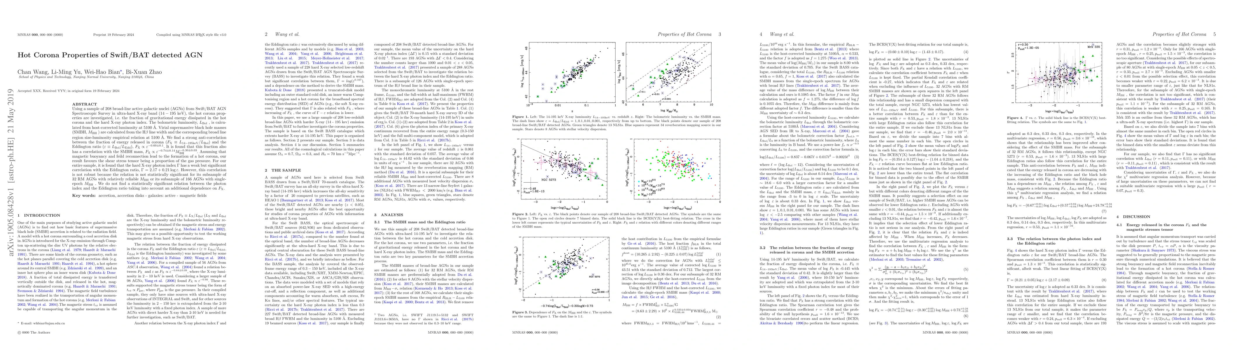 Using a sample of 208 broad-line active galactic nuclei (AGNs) from Swift/BAT AGN Spectroscopic Survey in ultra-hard X-ray band ($14-195$ keV), the hot corona properties are investigated, i.e. the fraction of gravitational energy dissipated in the hot corona and the hard X-ray photon index. The bolometric luminosity, \lb, is calculated from host-corrected luminosity at 5100 \AA. Virial supermassive black hole masses (SMBH, \mbh) are calculated from the $\rm H\beta$ line width and the corresponding broad line region size-luminosity empirical relation at 5100 \AA. We find a strong anti-correlation between the fraction of energy released in corona ($F_x \equiv L_{14-195 keV}/L_{\rm Edd}$) and the Eddington ratio ($ \varepsilon \equiv L_{\rm Bol}/L_{\rm Edd}$), $F_x \propto \varepsilon^{-0.60\pm 0.1}$. It is found that this fraction also has a correlation with the SMBH mass, $F_x \propto \varepsilon^{-0.74\pm 0.14} M_{\rm BH}^{-0.30\pm 0.03}$. Assuming that magnetic buoyancy and feild reconnection lead to the formation of a hot corona, our result favours the shear stress tensor being a proportion of the gas pressure. For our entire sample, it is found that the hard X-ray photon index $\Gamma$ has a weak but significant correlation with the Eddington ratio, $ \Gamma=2.17+0.21\log \varepsilon$. However, this correlation is not robust because the relation is not statistically significant for its subsample of 32 RM AGNs with relatively reliable $M_{\rm BH}$ or its subsample of 166 AGNs with single-epoch $M_{\rm BH}$. We do not find a statistically significant relation between the photon index and the Eddington ratio taking into account an additional dependence on $F_x$.