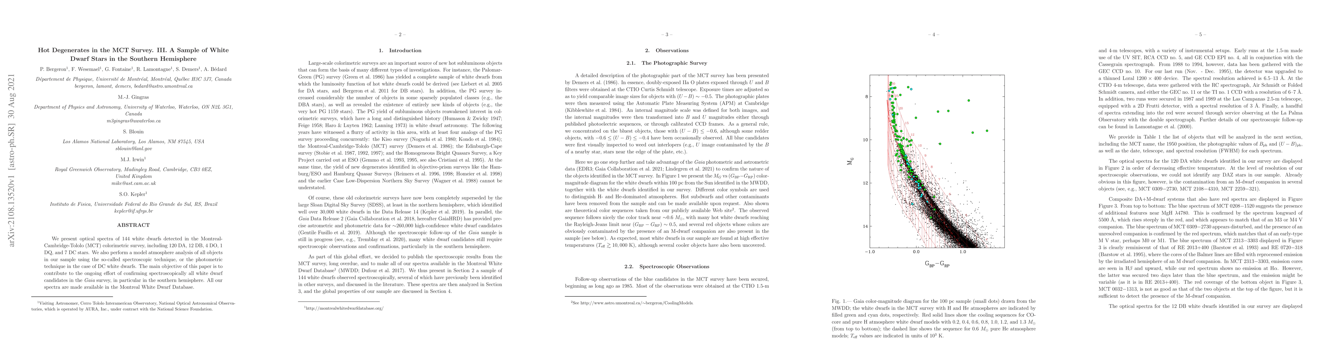 This paper presents optical spectra of 144 white dwarfs from the MCT survey, classified into DA, DB, DO, DQ, and DC types. A model atmosphere analysis was conducted using spectroscopic and photometric techniques. The findings aim to support Gaia survey efforts, particularly in the southern hemisphere, and all spectra are available in the Montreal White Dwarf Database.