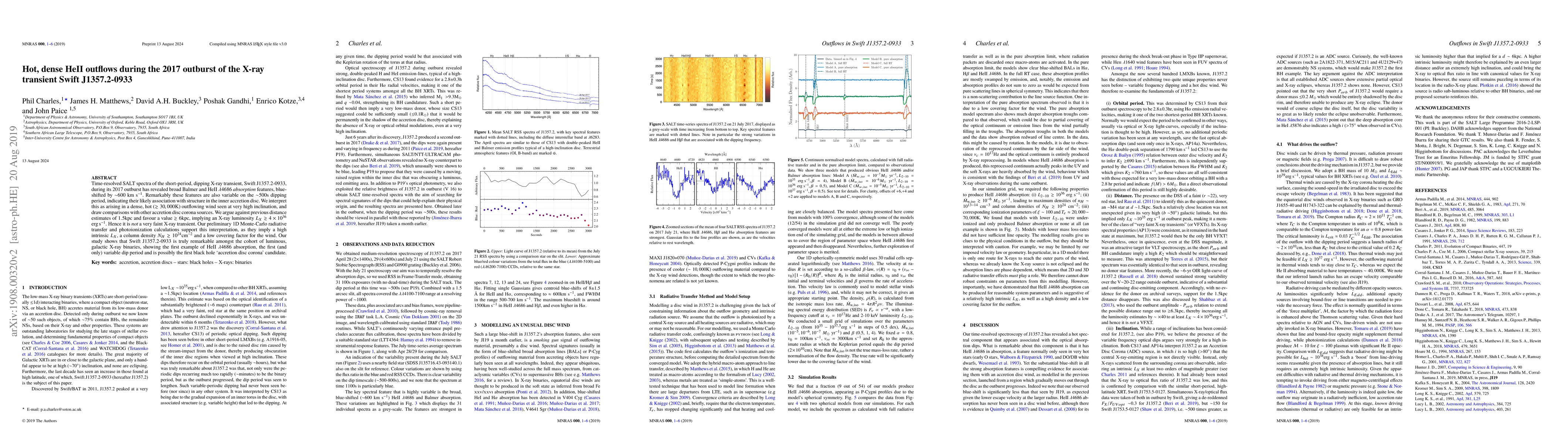 This study reveals hot, dense He II outflows during the 2017 outburst of Swift J1357.2-0933, characterized by variable, blue-shifted absorption features indicating an outflowing wind from the inner accretion disc. The findings suggest a distance greater than 6 kpc and an X-ray luminosity of at least 4x10^36 erg/s, marking it as a significant luminous X-ray binary.
