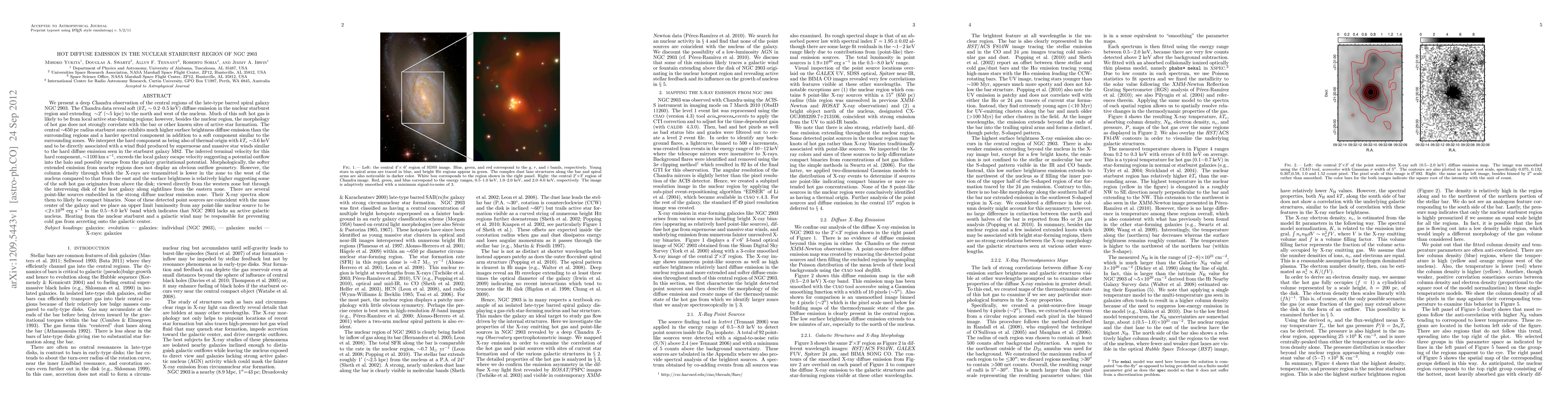 (Abridged) We present a deep Chandra observation of the late-type barred spiral galaxy NGC 2903. The Chandra data reveal soft (kT_e ~ 0.2-0.5keV) diffuse emission in the nuclear starburst region and extending ~5kpc to the north and west of the nucleus. Much of this soft hot gas is likely to be from local active star-forming regions; however, besides the nuclear region, the morphology of hot gas does not strongly correlate with sites of active star formation. The central ~650 pc radius starburst zone exhibits much higher surface brightness diffuse emission than the surrounding regions and a harder spectral component in addition to its soft component. We interpret the hard component as being of thermal origin with kT_e~3.6keV and to be directly associated with a wind fluid produced by supernovae and massive star winds. The inferred terminal velocity for this hard component, ~1100 km/s, exceeds the local galaxy escape velocity suggesting a potential outflow. The softer extended emission does not display an obvious outflow geometry. However, the column density through which the X-rays are transmitted is lower to the west of the nucleus compared to the east and the surface brightness is higher there suggesting some soft hot gas originates from above the disk; viewed directly from the western zone but through the intervening galaxy disk from the eastern zone. There are several point-like sources in the nuclear region with X-ray spectra typical of compact binaries. None of these are coincident with the mass center of the galaxy and we place an upper limit luminosity from any point-like nuclear source to be < 2x10^38 ergs/s in the 0.5-8.0keV band which indicates that NGC 2903 lacks an active galactic nucleus. Heating from the nuclear starburst and a galactic wind may be responsible for preventing cold gas from accreting onto the galactic center.