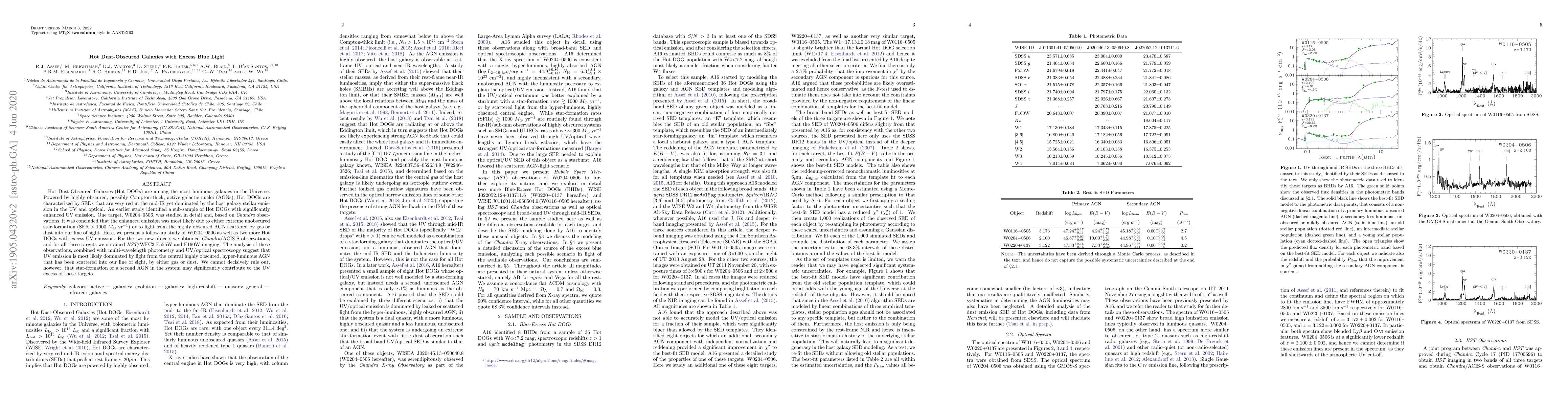 This study investigates Hot Dust-Obscured Galaxies (Hot DOGs) with excess blue light, focusing on three galaxies, including a detailed analysis of W0204-0506. The research concludes that the excess UV emission is mainly due to scattered light from a highly obscured, hyper-luminous AGN, though star-formation may also contribute in one case.