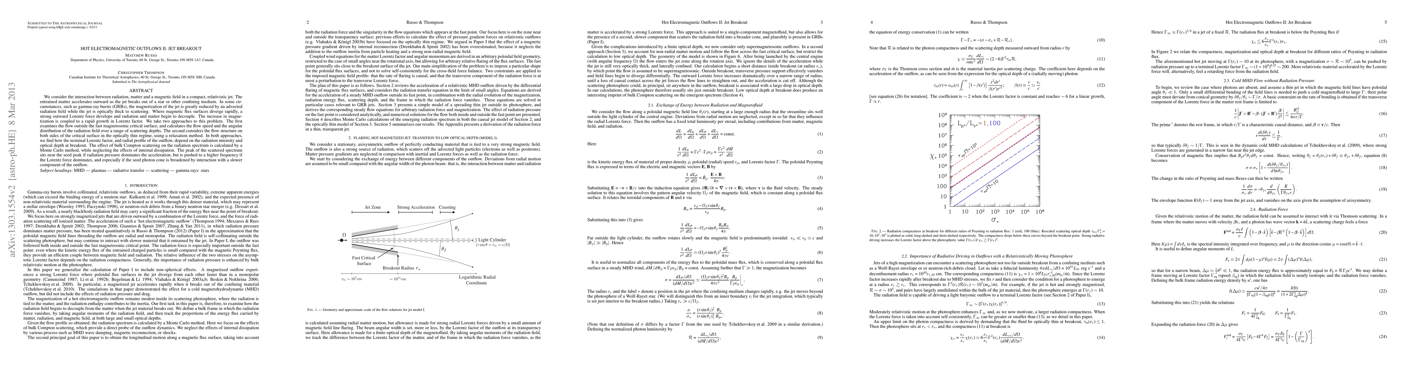 We consider the interaction between radiation, matter and a magnetic field in a compact, relativistic jet. The entrained matter accelerates outward as the jet breaks out of a star or other confining medium. In some circumstances, such as gamma-ray bursts (GRBs), the magnetization of the jet is greatly reduced by an advected radiation field while the jet is optically thick to scattering. Where magnetic flux surfaces diverge rapidly, a strong outward Lorentz force develops and radiation and matter begin to decouple. The increase in magnetization is coupled to a rapid growth in Lorentz factor. We take two approaches to this problem. The first examines the flow outside the fast magnetosonic critical surface, and calculates the flow speed and the angular distribution of the radiation field over a range of scattering depths. The second considers the flow structure on both sides of the critical surface in the optically thin regime, using a relaxation method. In both approaches, we find how the terminal Lorentz factor, and radial profile of the outflow, depend on the radiation intensity and optical depth at breakout. The effect of bulk Compton scattering on the radiation spectrum is calculated by a Monte Carlo method, while neglecting the effects of internal dissipation. The peak of the scattered spectrum sits near the seed peak if radiation pressure dominates the acceleration, but is pushed to a higher frequency if the Lorentz force dominates, and especially if the seed photon cone is broadened by interaction with a slower component of the outflow.