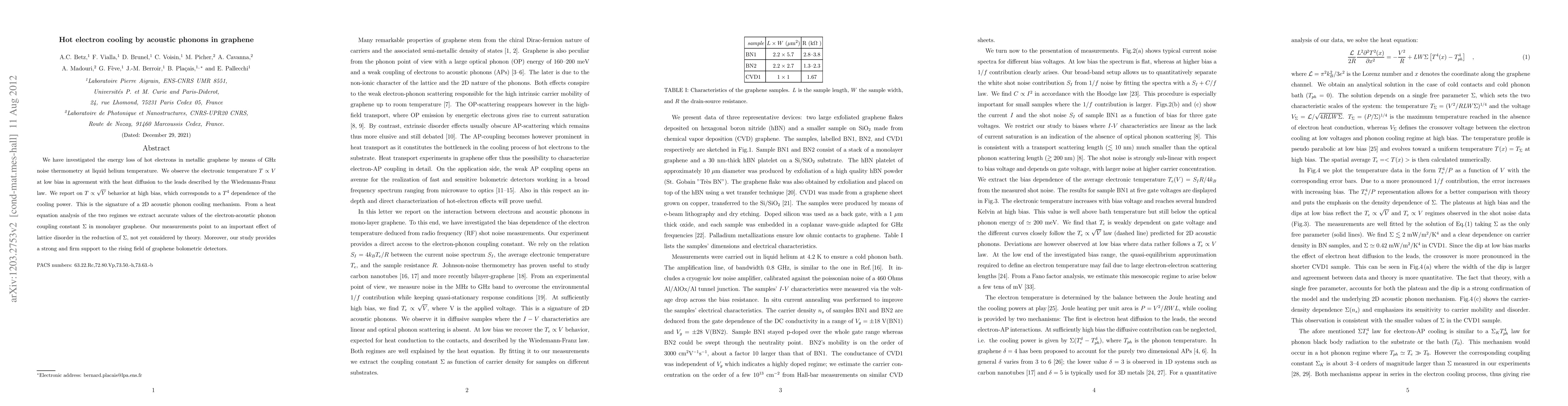 This study investigates the cooling mechanism of hot electrons in graphene using GHz noise thermometry, revealing a 2D acoustic phonon cooling process and determining the electron-acoustic phonon coupling constant. The findings highlight lattice disorder's role in reducing this coupling and support the development of graphene bolometric detectors.