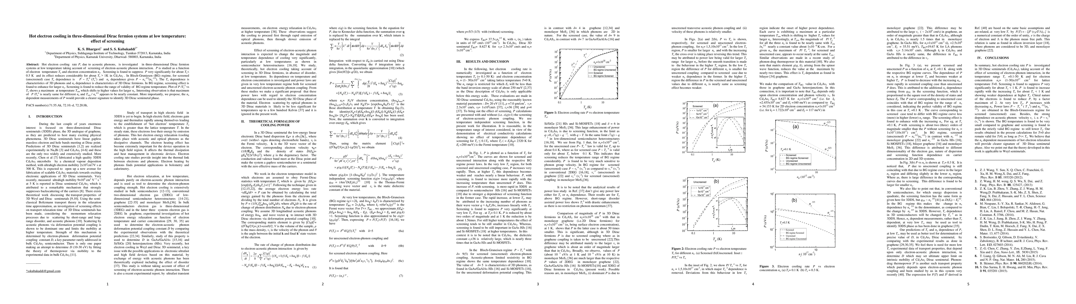 Hot electron cooling rate P, due to acoustic phonons, is investigated in three-dimensional Dirac fermion systems at low temperature taking account of screening of electron-acoustic phonon interaction. P is studied as a function of electron temperature T_e and electron concentration n_e. Screening is found to suppress P very significantly for about T_e < 0.5 K and its effect reduces considerably for about T_e > 1K in Cd_3As_2 . In Bloch-Gruniesen (BG) regime, for screened (unscreened) case T_e dependence is P ~ T_e^ 9 (T_e^ 5) and ne dependence gives P ~ n_e ^-5/3(n_e^-1/3). The T_e dependence is characteristics of 3D phonons and n_e dependence is characteristics of 3D Dirac fermions. In BG regime, screening effect is found to enhance for larger n_e. Screening is found to reduce the range of validity of BG regime temperature. Plot of P / T_e^ 4 vs T_e shows a maximum at temperature T_e m which shifts to higher values for larger n_e. Interesting observation is that maximum of P / T_e^4 is nearly same for different n_e and T_em / n_e^ 1/3 appears to be nearly constant. More importantly, we propose, the n_e dependent measurements of P would provide a clearer signature to identify 3D Dirac semimetal phase.