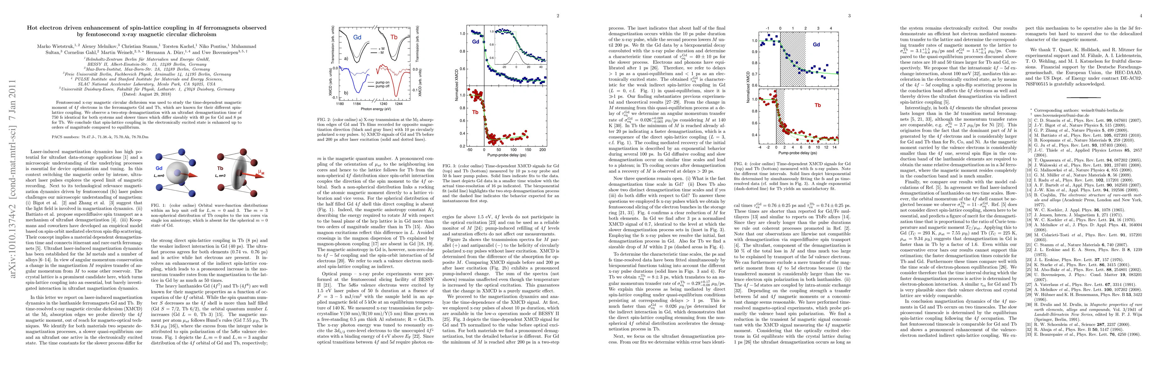 This study uses femtosecond x-ray magnetic circular dichroism to investigate the magnetic moment of 4f electrons in Gd and Tb ferromagnets, revealing a two-step demagnetization process. The findings show enhanced spin-lattice coupling in the excited state, significantly faster than at equilibrium.