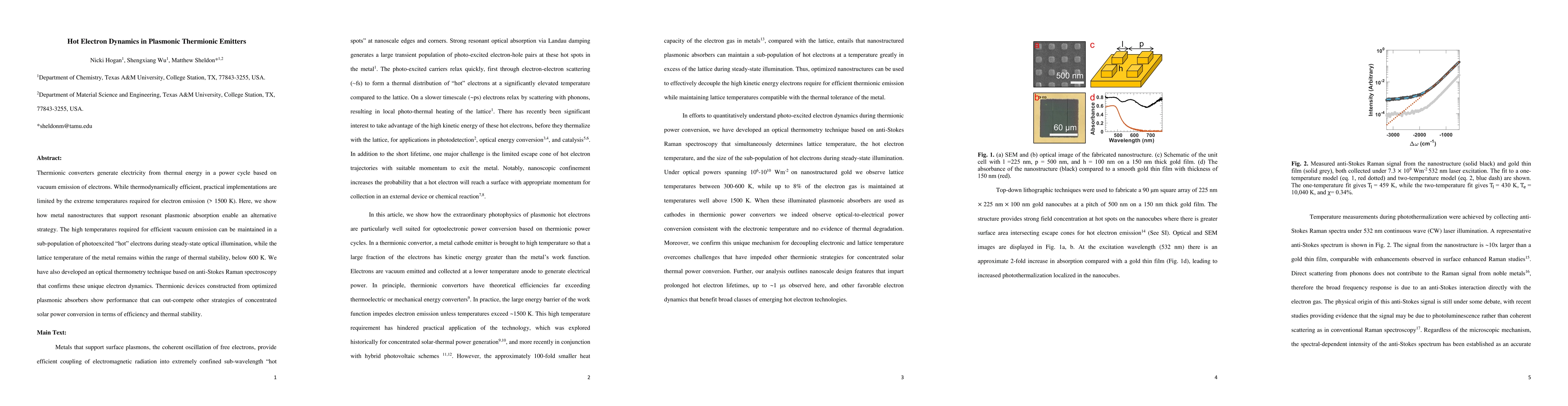 Thermionic converters generate electricity from thermal energy in a power cycle based on vacuum emission of electrons. While thermodynamically efficient, practical implementations are limited by the extreme temperatures required for electron emission (> 1500 K). Here, we show how metal nanostructures that support resonant plasmonic absorption enable an alternative strategy. High electronic temperatures required for efficient vacuum emission can be maintained during steady-state optical absorption while the lattice temperature remains within the range of thermal stability, below 600 K. We have also developed an optical thermometry technique based on anti-Stokes Raman spectroscopy that confirms these unique electron dynamics. Thermionic devices constructed from plasmonic absorbers show performance that can out-compete other strategies of concentrated solar power conversion in terms of efficiency and thermal stability.