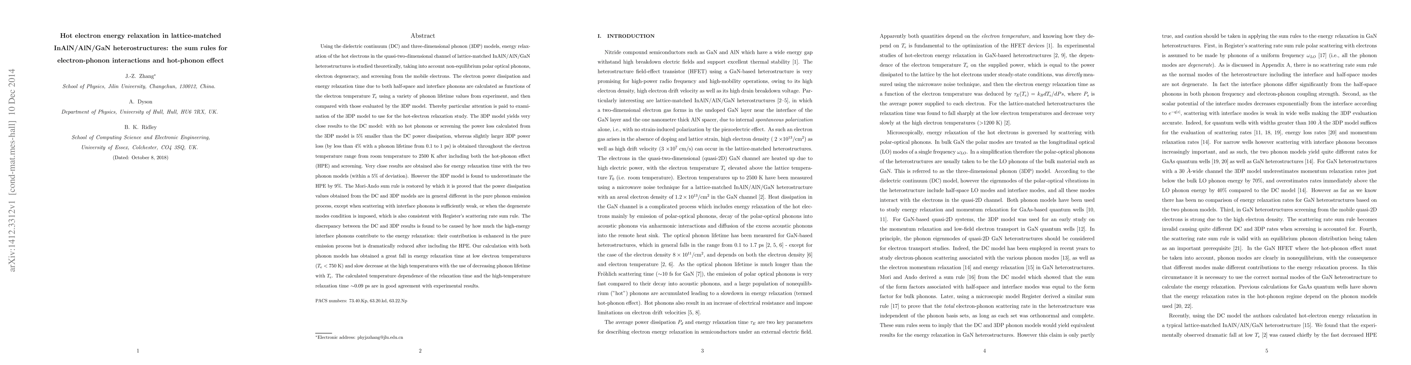 Using the dielectric continuum (DC) and three-dimensional phonon (3DP) models, energy relaxation of the hot electrons in the quasi-two-dimensional channel of lattice-matched InAlN/AlN/GaN heterostructures is studied theoretically. The electron power dissipation and energy relaxation time due to both half-space and interface phonons are calculated as functions of the electron temperature $T_e$ using a variety of phonon lifetime values from experiment, and then compared with those evaluated by the 3DP model. The 3DP model yields very close results to the DC model: with no hot phonons or screening the power loss calculated from the 3DP model is 5% smaller than the DC power dissipation, whereas slightly larger 3DP power loss (by less than 4% with a phonon lifetime from 0.1 to 1 ps) is obtained throughout the electron temperature range from room temperature to 2500 K after including both the hot-phonon effect (HPE) and screening. Very close results are obtained also for energy relaxation time with the two phonon models (within a 5% of deviation). However the 3DP model is found to underestimate the HPE by 9%. The Mori-Ando sum rule is restored by which it is proved that the power dissipation values obtained from the DC and 3DP models are in general different in the pure phonon emission process, except when scattering with interface phonons is sufficiently weak, or when the degenerate modes condition is imposed, which is also consistent with Register's scattering rate sum rule. Our calculation with both phonon models has obtained a great fall in energy relaxation time at low electron temperatures ($T_e<$ 750 K) and slow decrease at the high temperatures. The calculated temperature dependence of the relaxation time and the high-temperature relaxation time $\sim$0.09 ps are in good agreement with experimental results.
