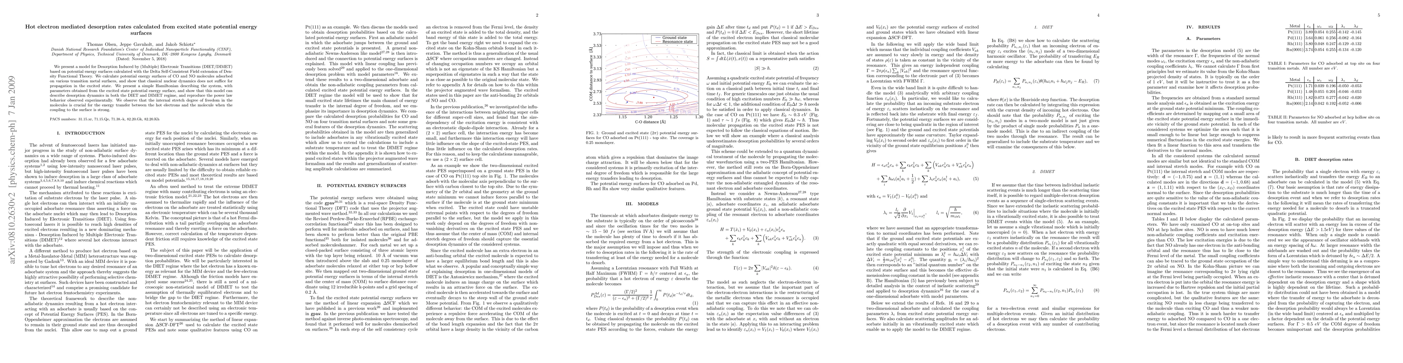 We present a model for Desorption Induce by (Multiple) Electronic Transitions (DIET/DIMET) based on potential energy surfaces calculated with the Delta Self-Consistent Field extension of Density Functional Theory. We calculate potential energy surfaces of CO and NO molecules adsorbed on various transition metal surfaces, and show that classical nuclear dynamics does not suffice for propagation in the excited state. We present a simple Hamiltonian describing the system, with parameters obtained from the excited state potential energy surface, and show that this model can describe desorption dynamics in both the DIET and DIMET regime, and reproduce the power law behavior observed experimentally. We observe that the internal stretch degree of freedom in the molecules is crucial for the energy transfer between the hot electrons and the molecule when the coupling to the surface is strong.