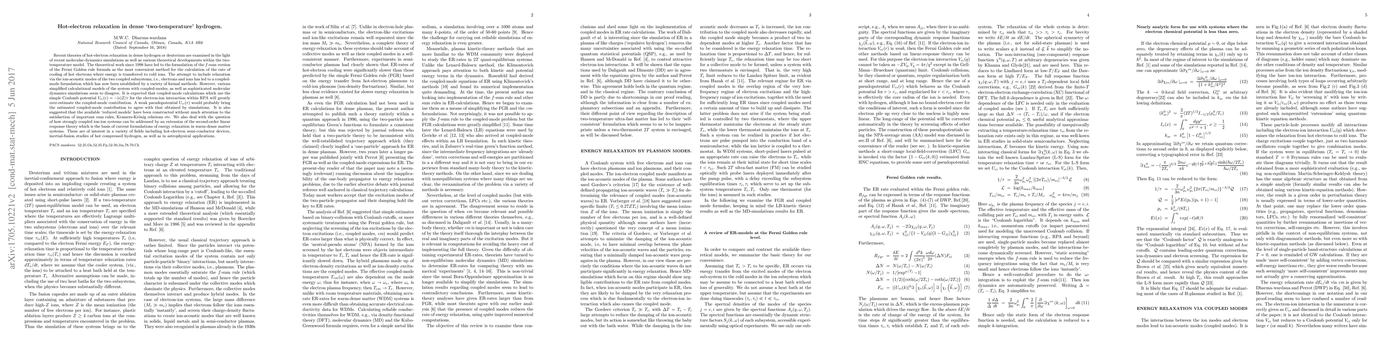 Recent theories of hot-electron relaxation in dense hydrogen or deuterium are examined in the light of recent molecular-dynamics simulations as well as various theoretical developments within the two-temperature model. The theoretical work since 1998 have led to the formulation of the $f$-sum version of the Fermi Golden rule formula as the most convenient method for the calculation of the rate of cooling of hot electrons where energy is transferred to cold ions. The attempt to include relaxation via the ion-acoustic modes of the two coupled subsystems, i.e., electrons and ions has led to a coupled-mode formulation which has now been established by a variety of formal methods. However, various simplified calculational models of the system with coupled-modes, as well as sophisticated molecular dynamics simulations seem to disagree. It is expected that coupled-mode calculations which use the simple Coulomb potential $V_{ei}(r)=-|e|Z/r$ for the electron-ion interaction within RPA will greatly over-estimate the coupled-mode contribution. A weak pseudopotential $U_{ei}(r)$ would probably bring the estimated coupled-mode contribution to agree with that obtained by simulations. It is suggested that the available `reduced models' have been constructed without much attention to the satisfaction of important sum rules, Kramers-Kr\"onig relations etc. We also deal with the question of how strongly coupled ion-ion systems can be addressed by an extension of the second-order linear response theory which is the basis of current formulations of energy relaxation in warm-dense matter systems. These are of interest in a variety of fields including hot-electron semi-conductor devices, inertial-fusion studies of hot compressed hydrogen, as well as in astrophysical applications.