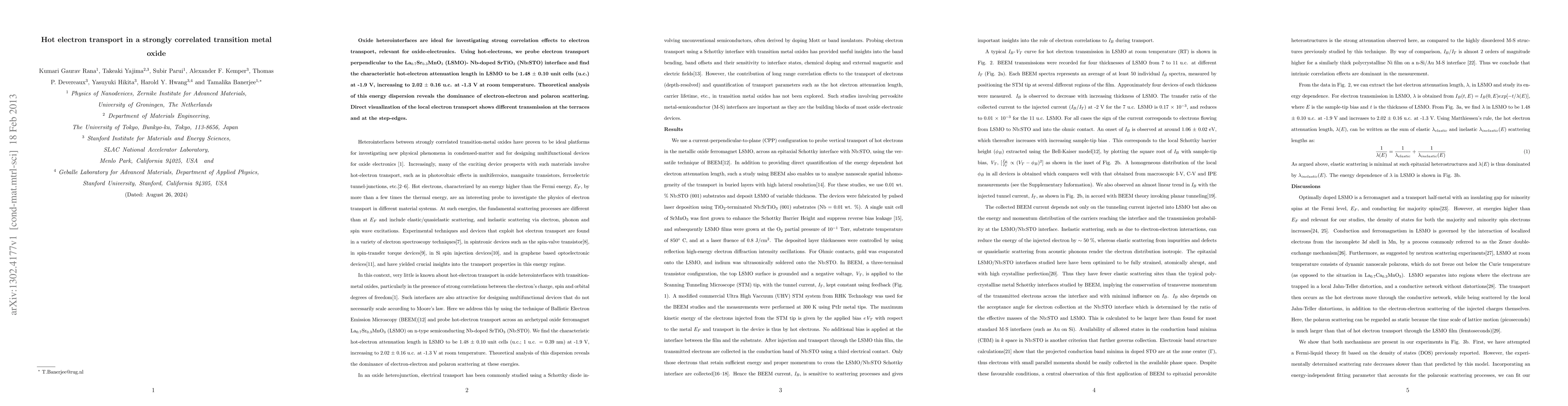 This study investigates hot-electron transport across a LSMO-Nb:STO interface, finding an attenuation length of 1.48 ± 0.10 unit cells at -1.9 V, increasing to 2.02 ± 0.16 unit cells at -1.3 V, indicating electron-electron and polaron scattering dominance. Local transport visualization reveals different transmission at terraces versus step-edges.