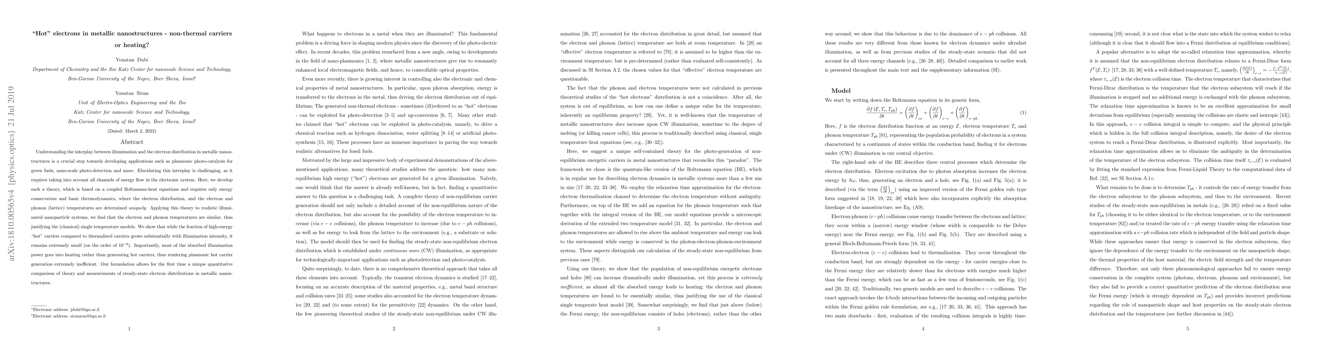 This paper develops a theoretical framework based on coupled Boltzmann-heat equations to understand electron dynamics in metallic nanostructures under illumination. The study finds that while high-energy "hot" carriers increase with intensity, they remain rare, and most absorbed energy results in heating rather than generating hot carriers, indicating inefficient plasmonic hot carrier generation.