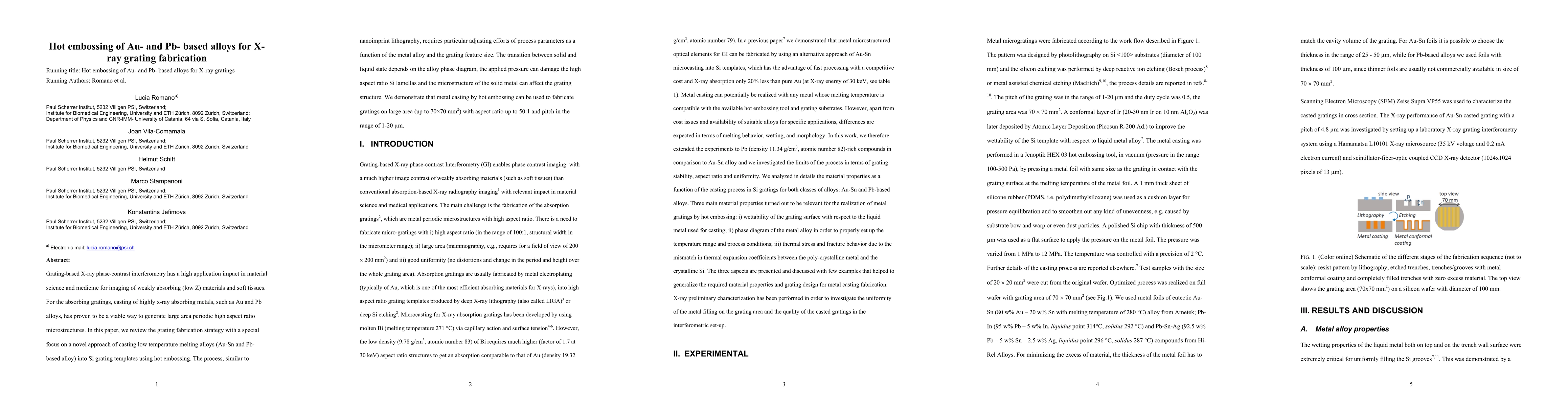 This paper reviews the hot embossing technique for fabricating X-ray gratings using Au-Sn and Pb-based alloys, focusing on the process parameters and challenges. The method allows for the creation of large area, high aspect ratio microstructures suitable for X-ray phase-contrast imaging.
