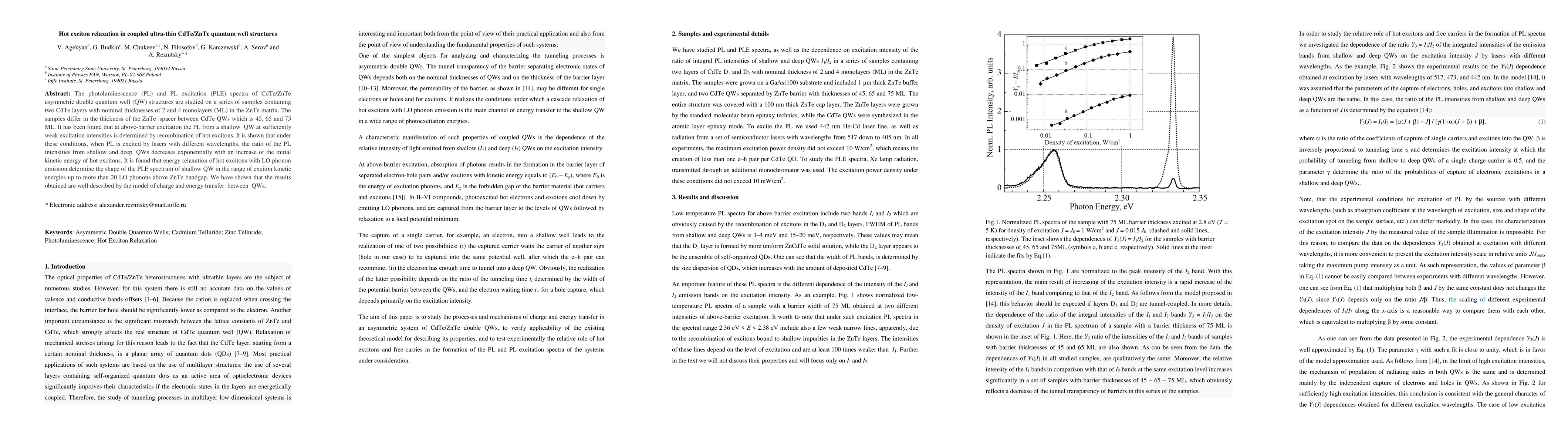 This paper investigates the photoluminescence and excitation spectra of CdTe/ZnTe asymmetric double quantum well structures, revealing that hot exciton relaxation is governed by the recombination of hot excitons and energy relaxation via LO phonon emission. The study demonstrates that the PL intensity ratio from shallow and deep quantum wells decreases exponentially with the initial kinetic energy of hot excitons, consistent with a model of charge and energy transfer between quantum wells.