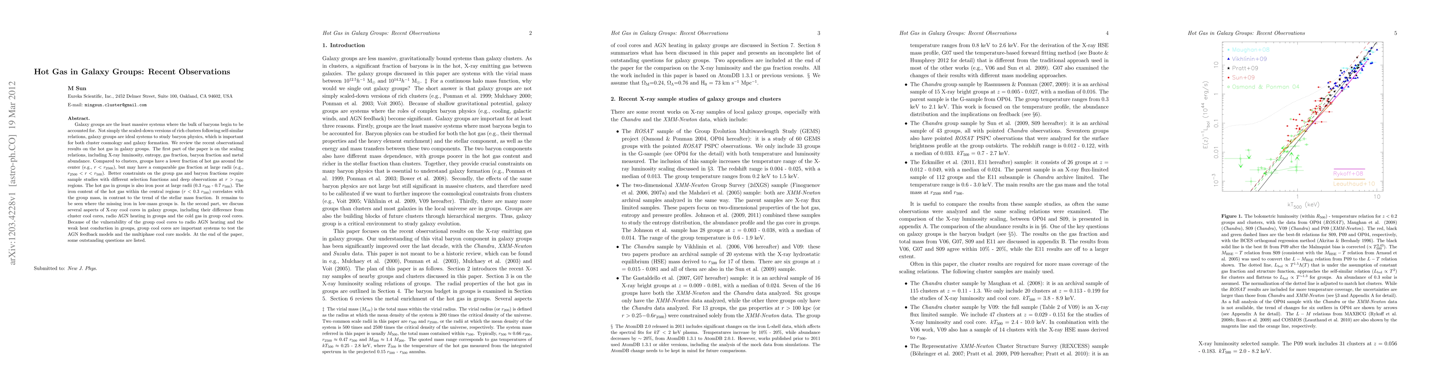 This paper reviews recent observations of hot gas in galaxy groups, focusing on scaling relations and the iron content. It highlights differences in gas fractions and metal abundances compared to clusters, emphasizing the need for deeper observations to better understand group baryon physics and the impact of radio AGN heating on group cool cores.