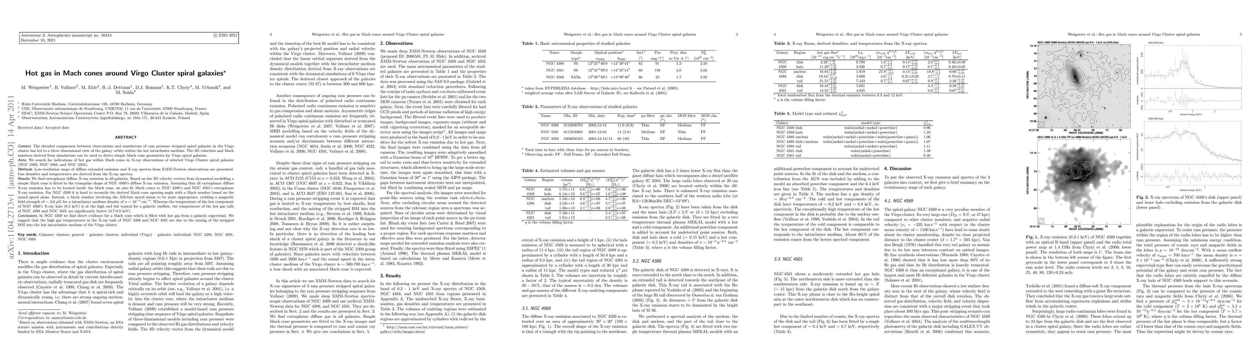 This study investigates the hot gas within Mach cones around spiral galaxies in the Virgo Cluster, finding extraplanar diffuse X-ray emission indicative of Mach cones. For NGC 4569, evidence suggests a galactic superwind filling the cone, while higher temperatures in NGC 4388 and NGC 4501's tails are attributed to ISM mixing with the intracluster medium.