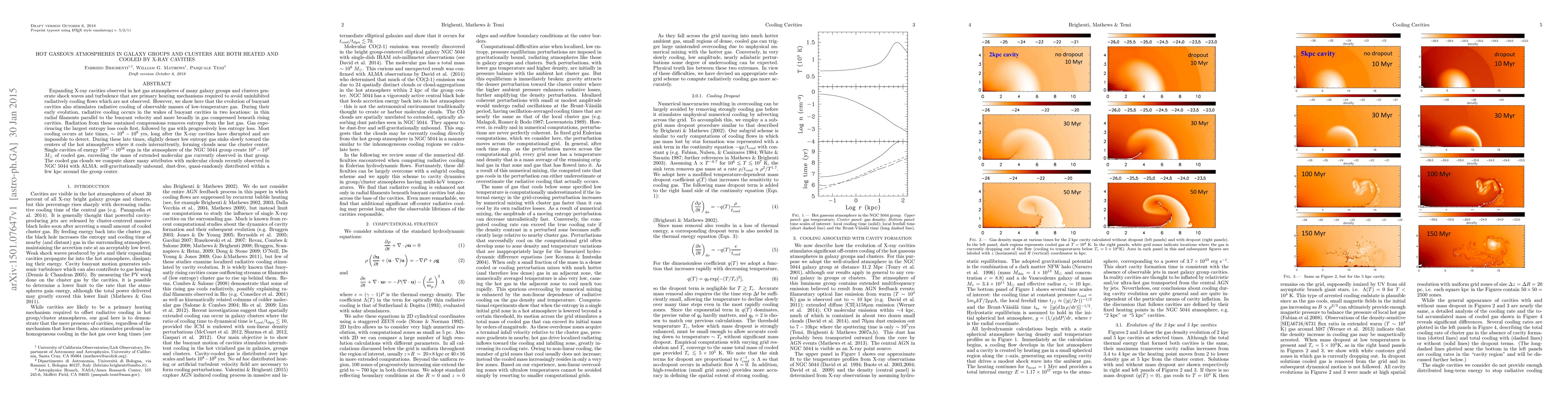 Hot gas in galaxy groups and clusters is both heated and cooled by X-ray cavities, with cooling occurring primarily through radiative processes that remove entropy from the hot gas, leading to formation of clouds near cluster centers.