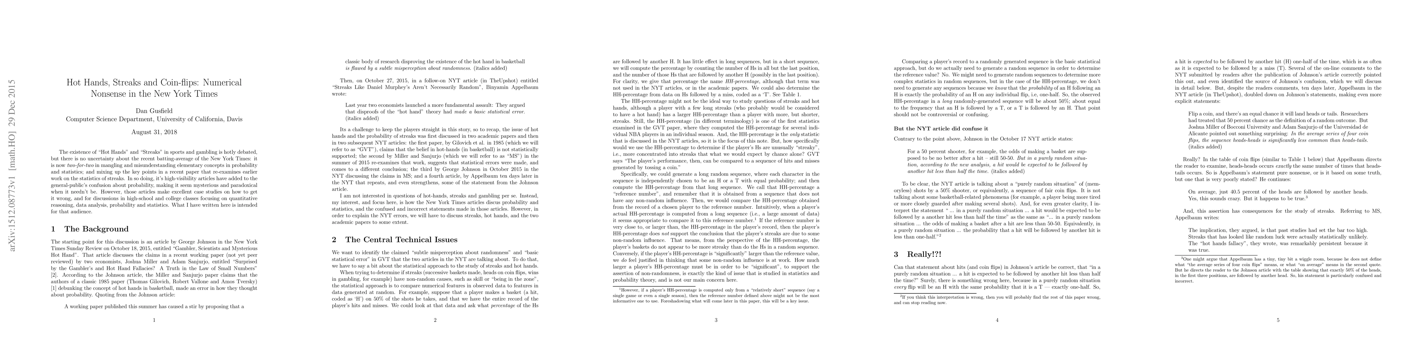 The existence of "Hot Hands" and "Streaks" in sports and gambling is hotly debated, but there is no uncertainty about the recent batting-average of the New York Times: it is now two-for-two in mangling and misunderstanding elementary concepts in probability and statistics; and mixing up the key points in a recent paper that re-examines earlier work on the statistics of streaks. In so doing, it's high-visibility articles have added to the general-public's confusion about probability, making it seem mysterious and paradoxical when it needn't be. However, those articles make excellent case studies on how to get it wrong, and for discussions in high-school and college classes focusing on quantitative reasoning, data analysis, probability and statistics. What I have written here is intended for that audience.