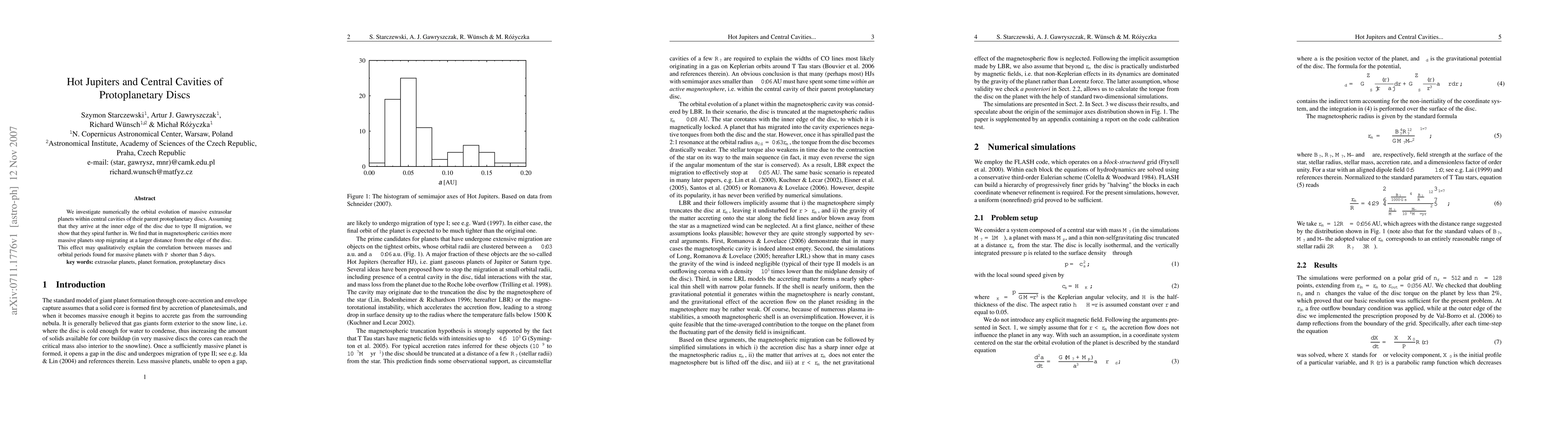 This study numerically explores the orbital evolution of massive extrasolar planets within central cavities of protoplanetary discs, revealing that type II migration drives them further inward. More massive planets tend to halt migration closer to the disc's edge in magnetospheric cavities, potentially explaining the observed correlation between mass and orbital period for short-period hot Jupiters.