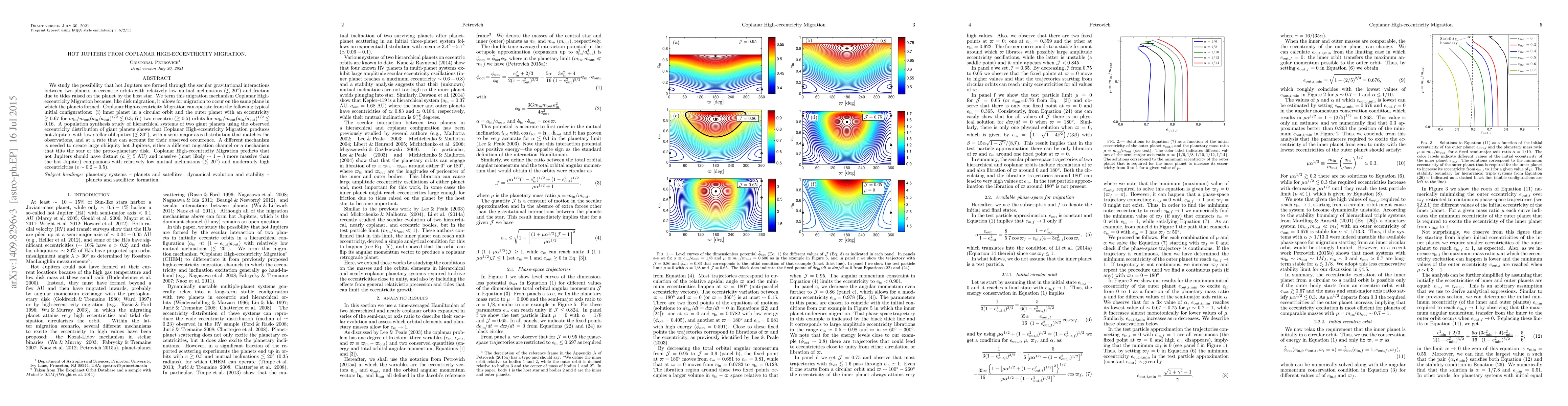 This paper explores the formation of hot Jupiters via Coplanar High-eccentricity Migration, a process driven by secular gravitational interactions and tidal friction. It predicts that such hot Jupiters will have distant, massive companions with low mutual inclinations and moderate eccentricities.