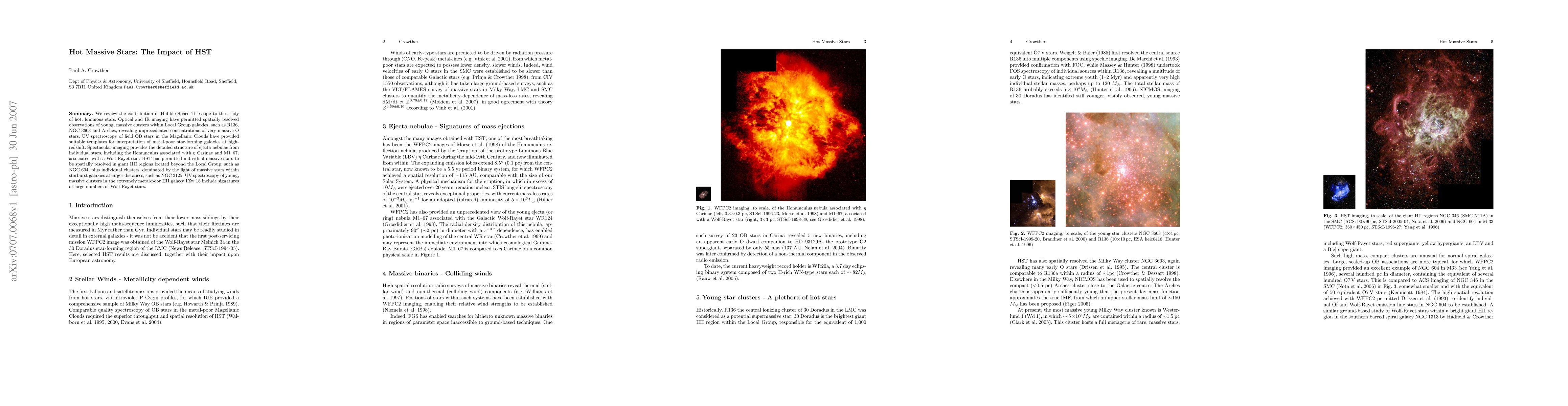 We review the contribution of Hubble Space Telescope to the study of hot, luminous stars. Optical and IR imaging have permitted spatially resolved observations of young, massive clusters within Local Group galaxies, such as R136, NGC 3603 and Arches, revealing unprecedented concentrations of very massive O stars. UV spectroscopy of field OB stars in the Magellanic Clouds have provided suitable templates for interpretation of metal-poor star-forming galaxies at high-redshift. Spectacular imaging provides the detailed structure of ejecta nebulae from individual stars, including the Homunculus associated with eta Carinae and M1-67, associated with a Wolf-Rayet star. HST has permitted individual massive stars to be spatially resolved in giant HII regions located beyond the Local Group, such as NGC 604, plus individual clusters, dominated by the light of massive stars within starburst galaxies at larger distances, such as NGC 3125. UV spectroscopy of young, massive clusters in the extremely metal-poor HII galaxy I Zw 18 include signatures of large numbers of Wolf-Rayet stars.