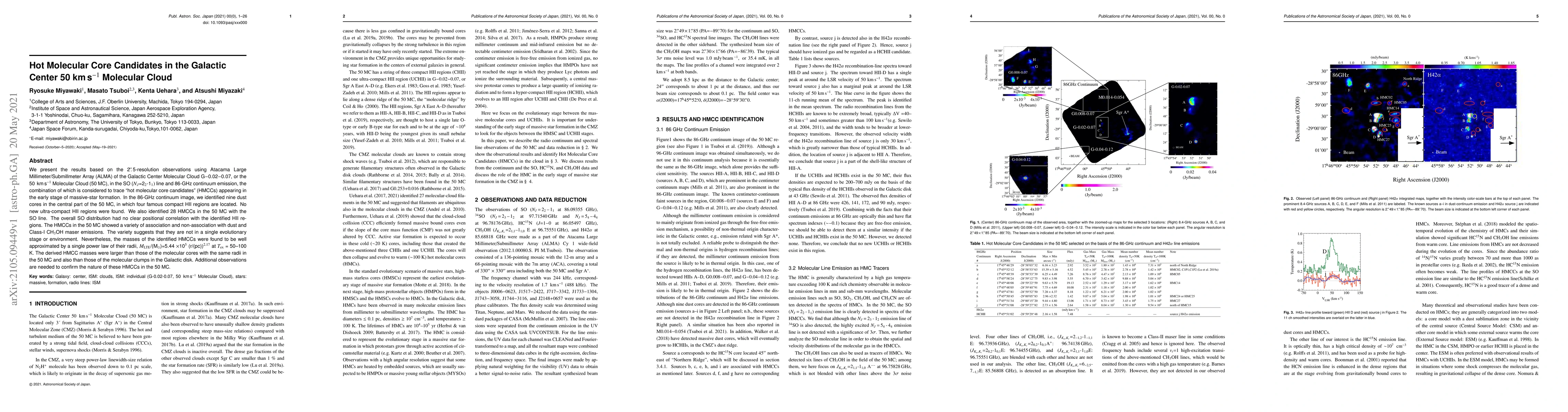We present the results based on the 2.5 arcsec-resolution observations using Atacama Large Millimeter/submillimeter Array (ALMA) of the Galactic Center Molecular Cloud G-0.02-0.07, or the 50 km/s Molecular Cloud (50MC), in the SO (N_J=2_2-1_1) line and 86-GHz continuum emission, the combination of which is considered to trace "hot molecular core candidates" (HMCCs) appearing in the early stage of massive star formation. In the 86-GHz continuum image, we identified nine dust cores in the central part of the 50MC, in which four famous compact HII regions are located. No new ultra-compact HII regions were found. We also identified 28 HMCCs in the 50MC with the SO line. The overall SO distribution had no clear positional correlation with the identified HII regions. The HMCCs in the 50MC showed a variety of association and non-association with dust and Class-I CH3OH maser emissions. The variety suggests that they are not in a single evolutionary stage or environment. Nevertheless, the masses of the identified HMCCs were found to be well approximated by a single power law of their radii, M_LTE/(M_sun)=5.44 x 10^5 (r/(pc))^2.17 at T_ex = 50-100 K. The derived HMCC masses were larger than those of the molecular cores with the same radii in the 50MC and also than those of the molecular clumps in the Galactic disk. Additional observations are needed to confirm the nature of these HMCCs in the 50MC.