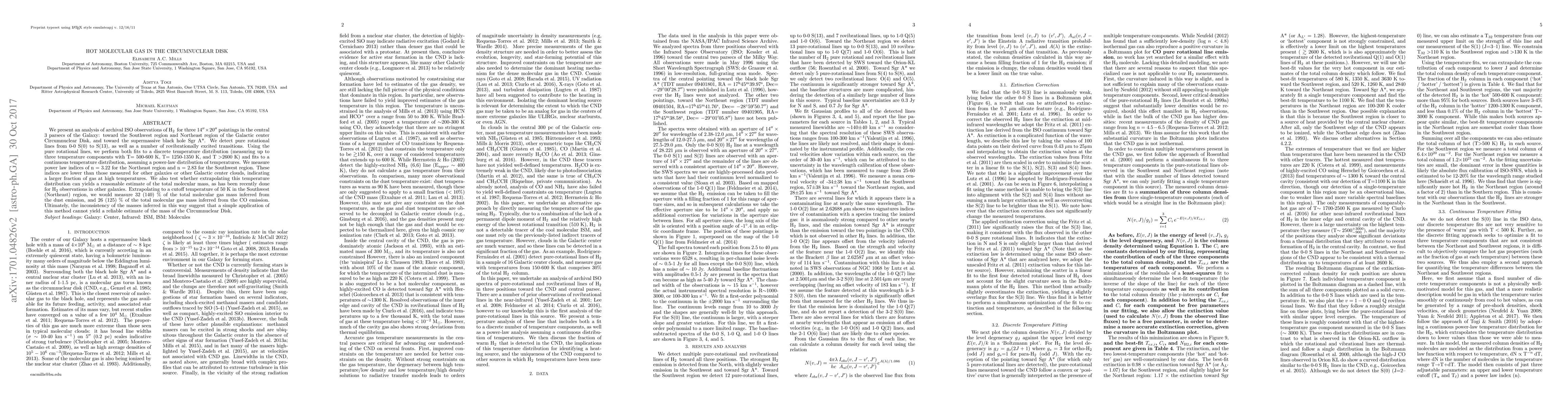 This paper analyzes ISO observations of H2 lines in the Galactic center's Circumnuclear Disk, identifying three temperature components in the molecular gas: hot, hotter, and hottest. The method used to estimate gas mass shows discrepancies between regions, indicating it cannot yet provide a reliable mass estimate.