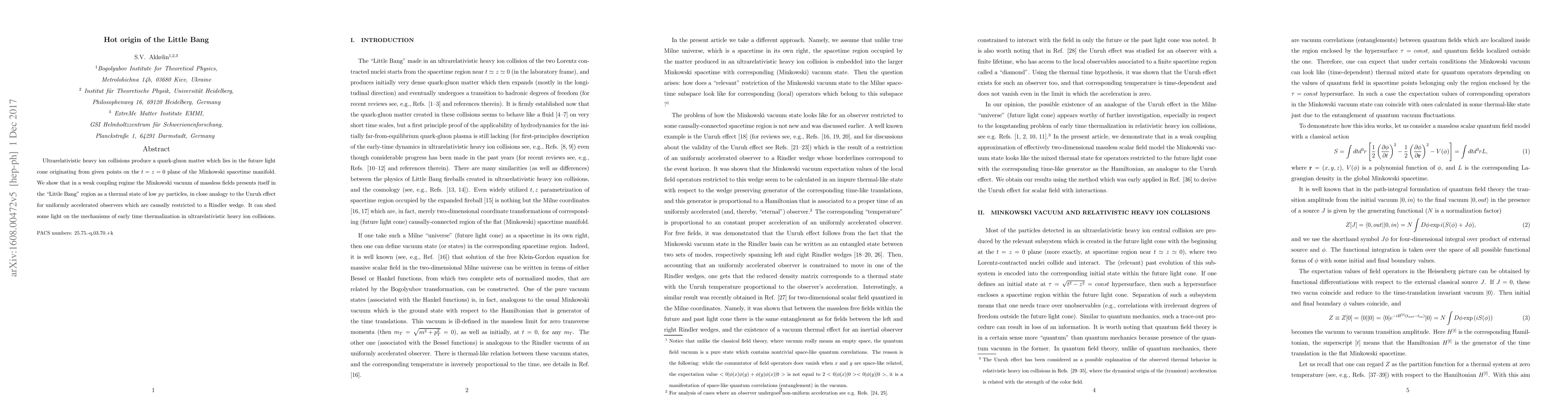 Ultrarelativistic heavy ion collisions produce a quark-gluon matter which lies in the future light cone originating from given points on the $t=z=0$ plane of the Minkowski spacetime manifold. We show that in a weak coupling regime the Minkowski vacuum of massless fields presents itself in the "Little Bang" region as a thermal state of low $p_{T}$ particles, in close analogy to the Unruh effect for uniformly accelerated observers which are causally restricted to a Rindler wedge. It can shed some light on the mechanisms of early time thermalization in ultrarelativistic heavy ion collisions.